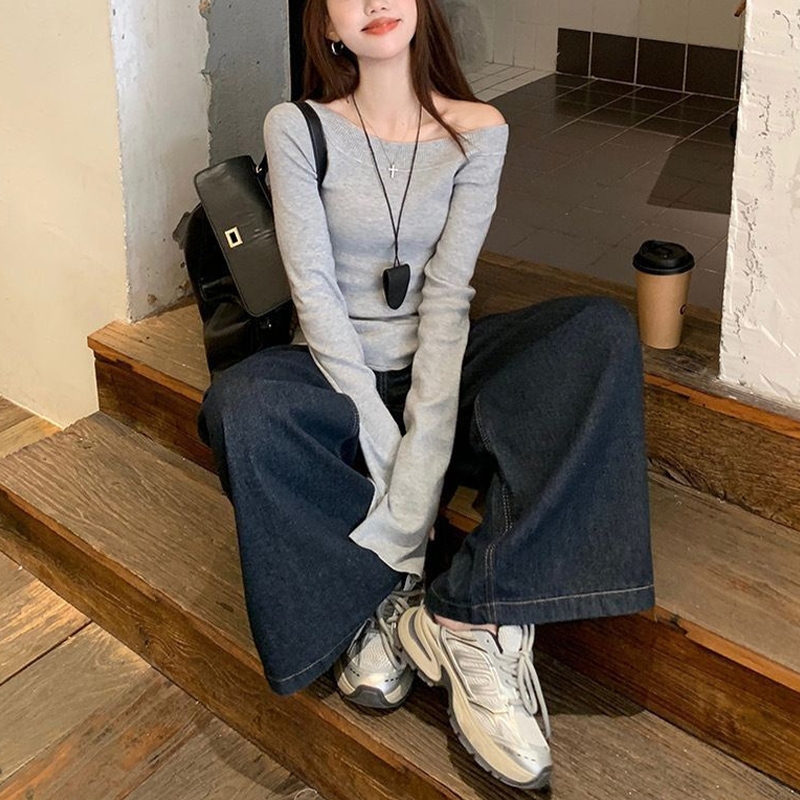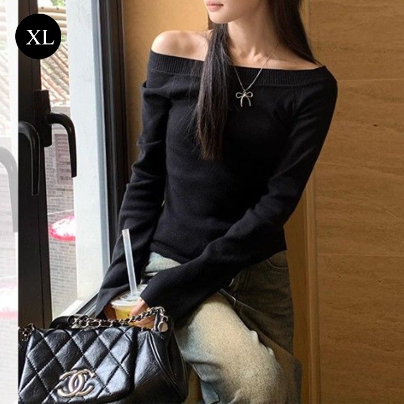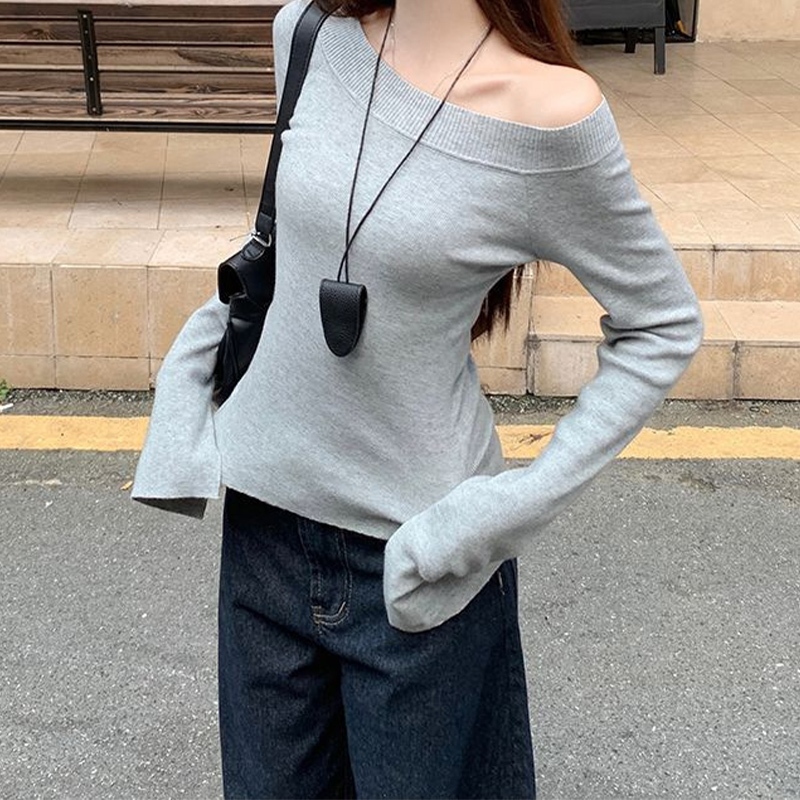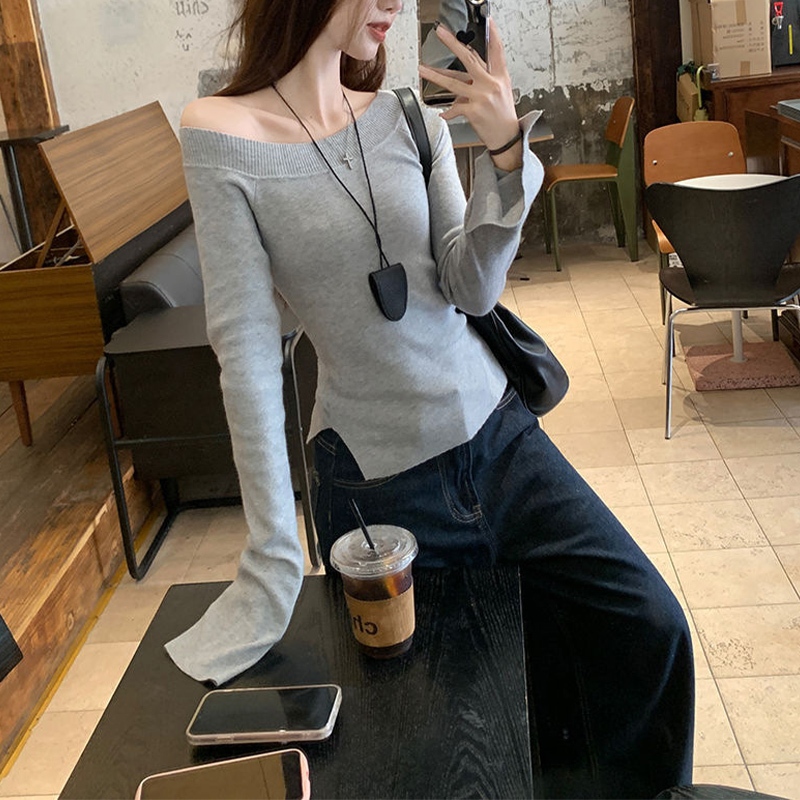 Off Shoulder Long Sleeved T-shirt Hot Girl Slim Fitting Bottoming Shirt Niche Split Top PR