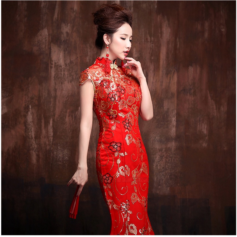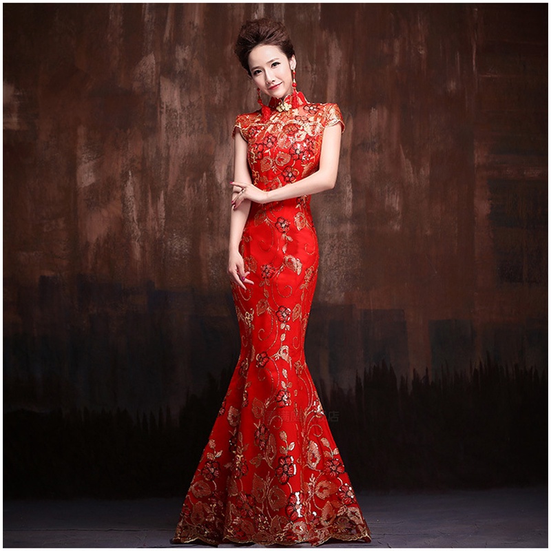 New Women Red Wedding Cheongsam Fishtail Dress Qipao Gold Embroidery Chinese Traditional Long Evening Dresses Party Show Costume