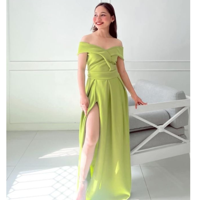 Plus size Off-Shoulder Flare Maxi Dress with Slit by La Filipiniana Clothing – Stretchable Neoprene