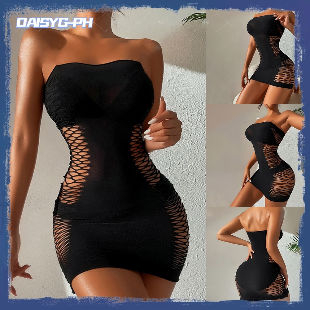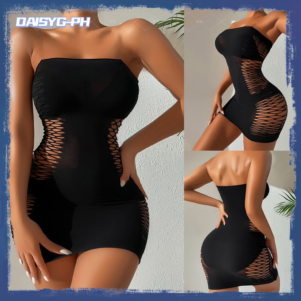 DAISYG Women Tube Top Skirt Sexy Fishnet Uniform Temptation Mesh Tight Dress