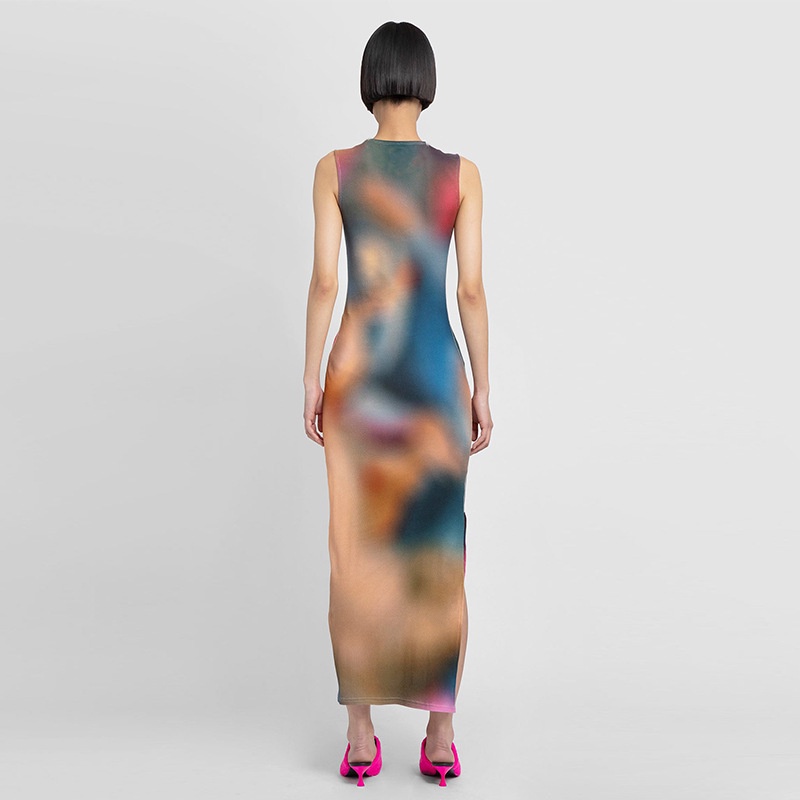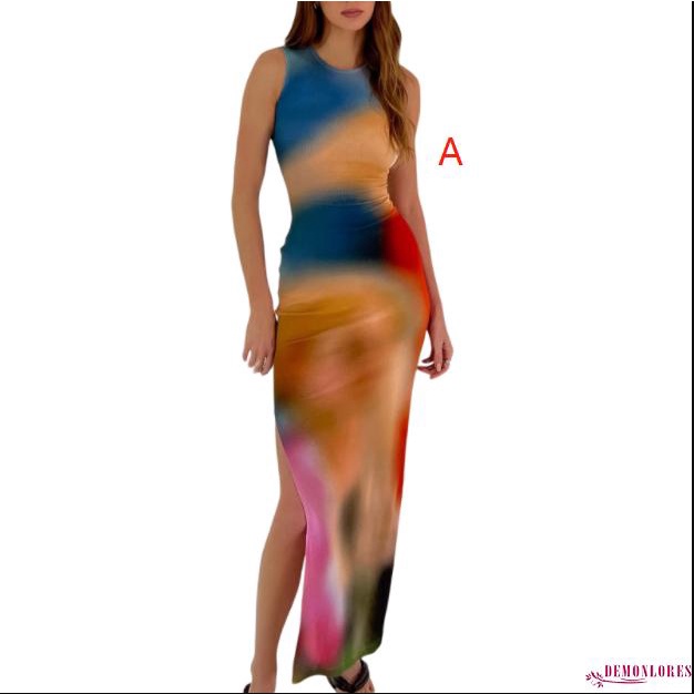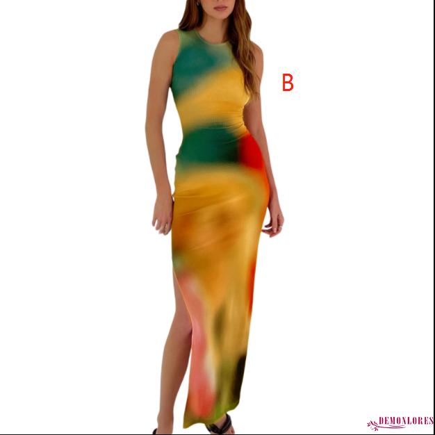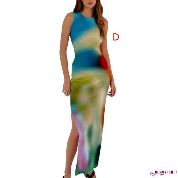 Demonlores-Women´s Summer Long Dress Sleeveless O Neck Tie Dye Print Side Split Skinny Dress
