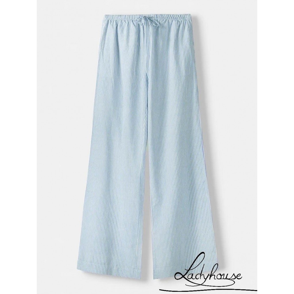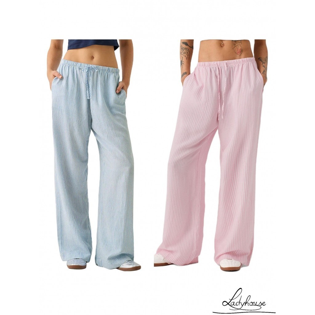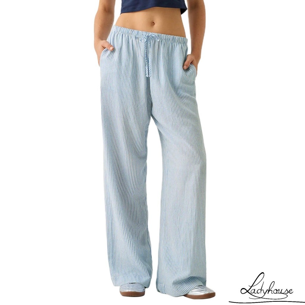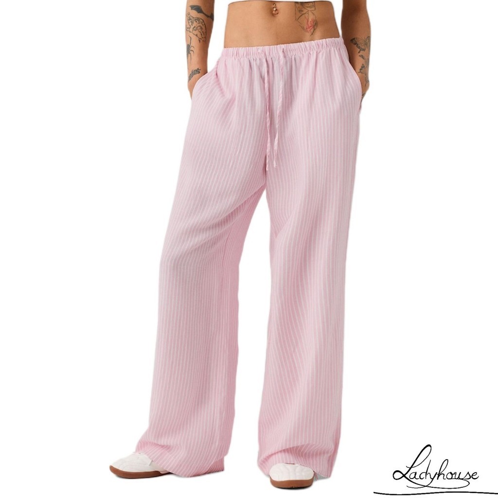 LDD-Women Striped Pants Elastic Waist Loose Trousers Streetwear Loungewear with Pockets