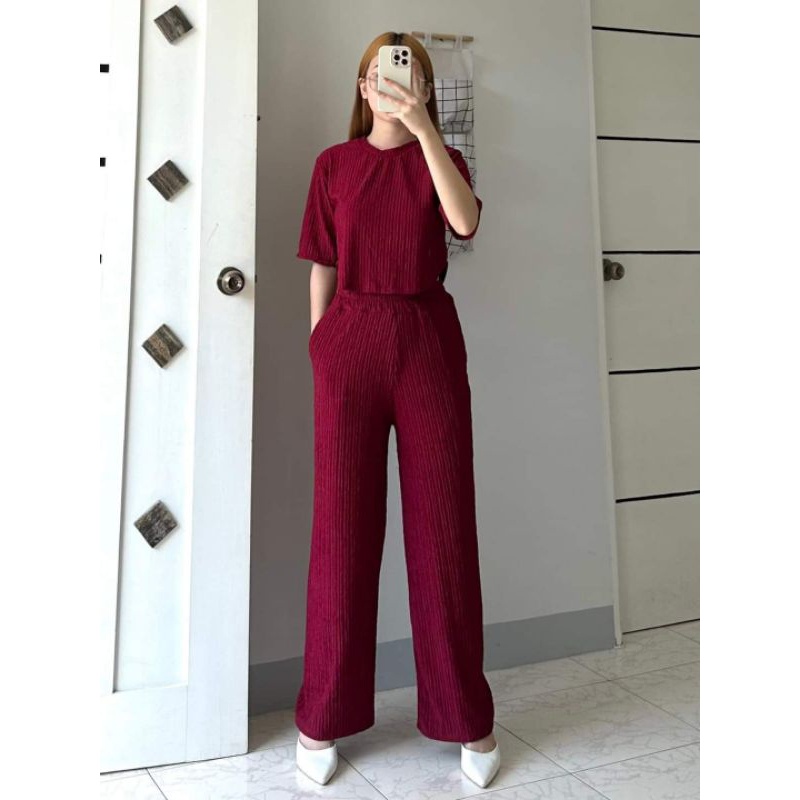 Jenny Plain Basic Roundneck Crop Top Terno Highwaist Wideleg Pants Coords Set Trendy Women Casual