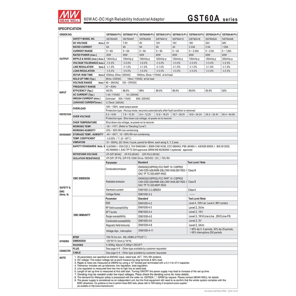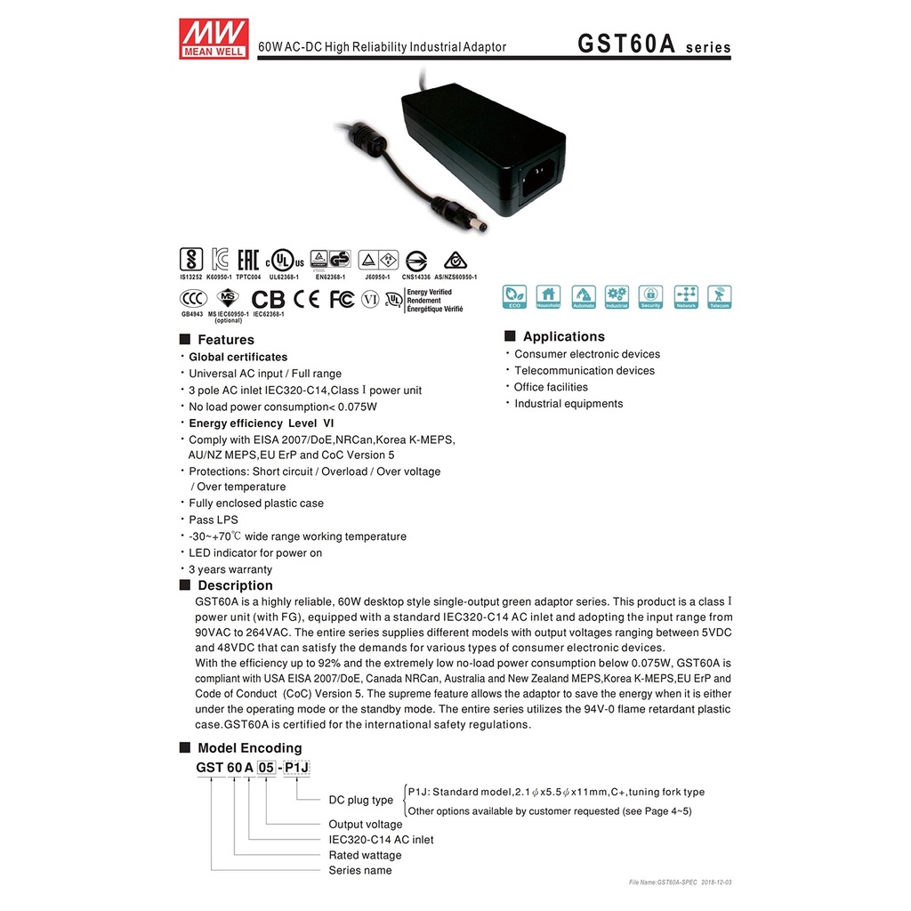 GST60A24-P1J MEAN WELL Industrial Desktop Adaptor 110V/220VAC To 24VDC 2.5A 60W Meanwell Level VI Adapter Switching Powe