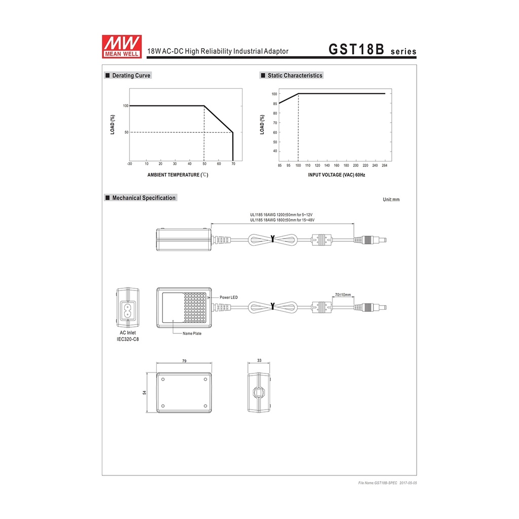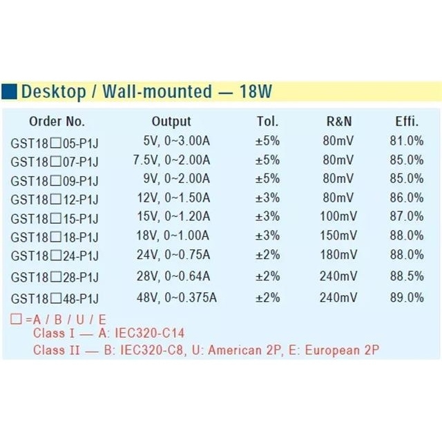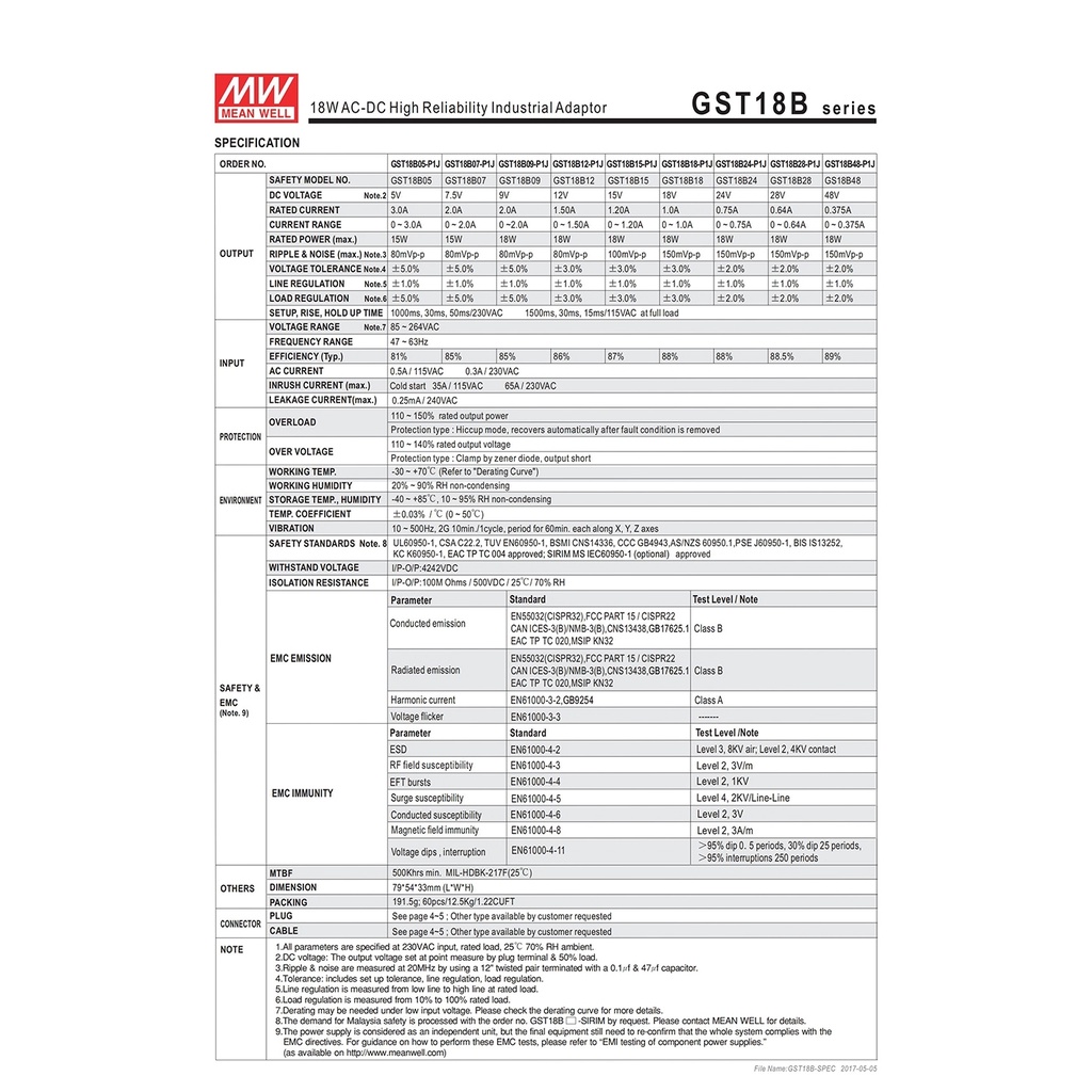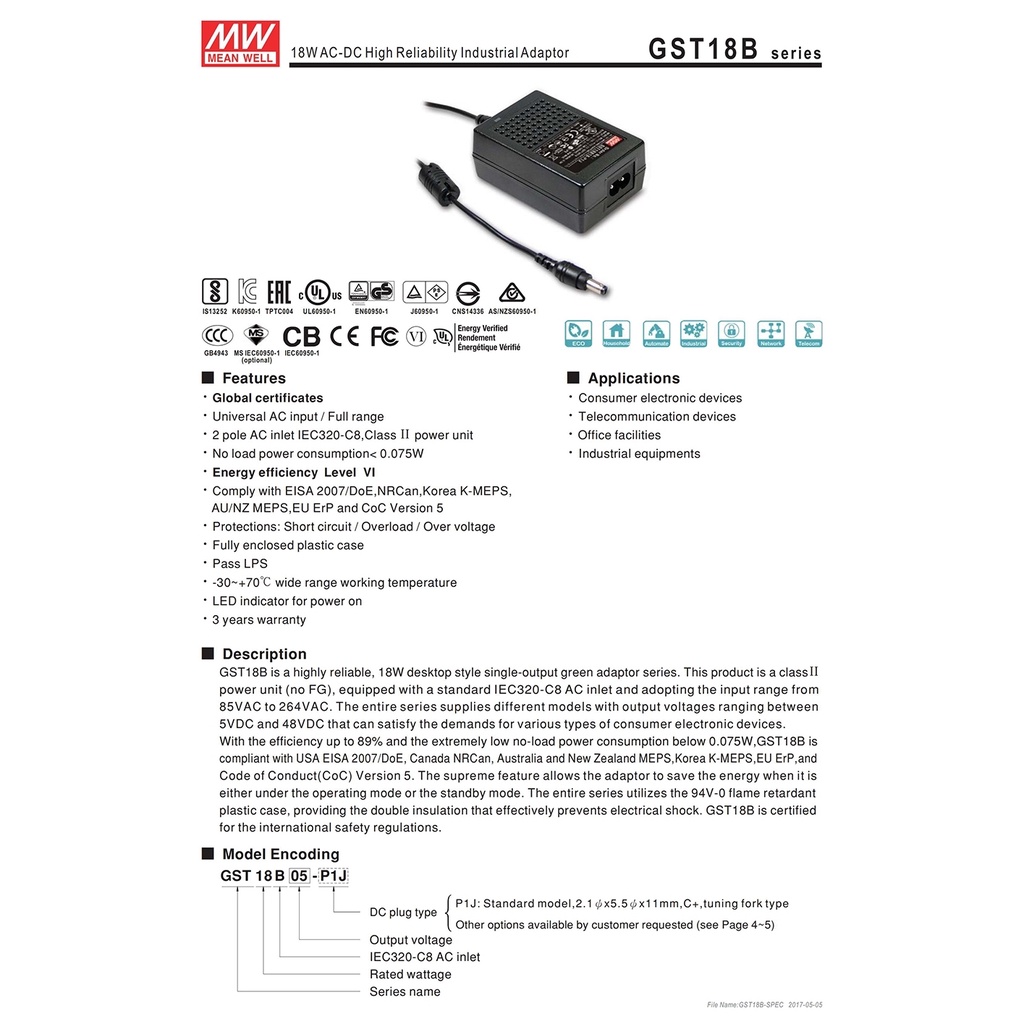 MEAN WELL GST18B12-P1J Industrial Desktop Adaptor 12V 1.5A 18W Meanwell Level VI Adapter Switch Power Supply DC 2.1*5.5 AC 2pole