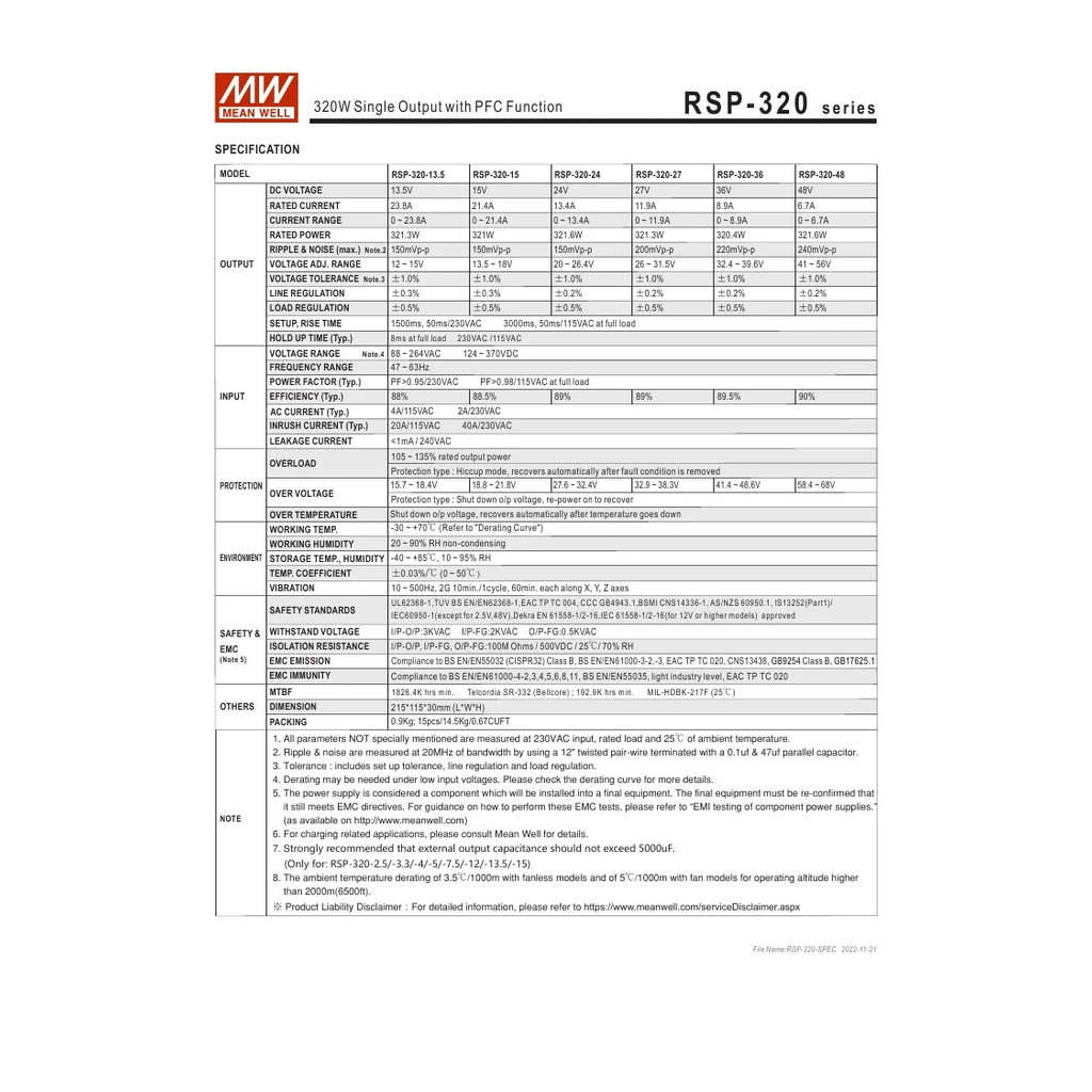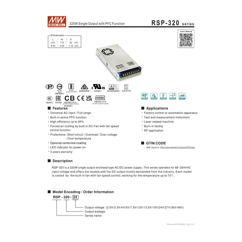 Original MEAN WELL RSP-320 Series 320W RSP-320-3.3/5/7.5/12/15/24/27/36/48V Single Single Output with PFC Function Switching power supply