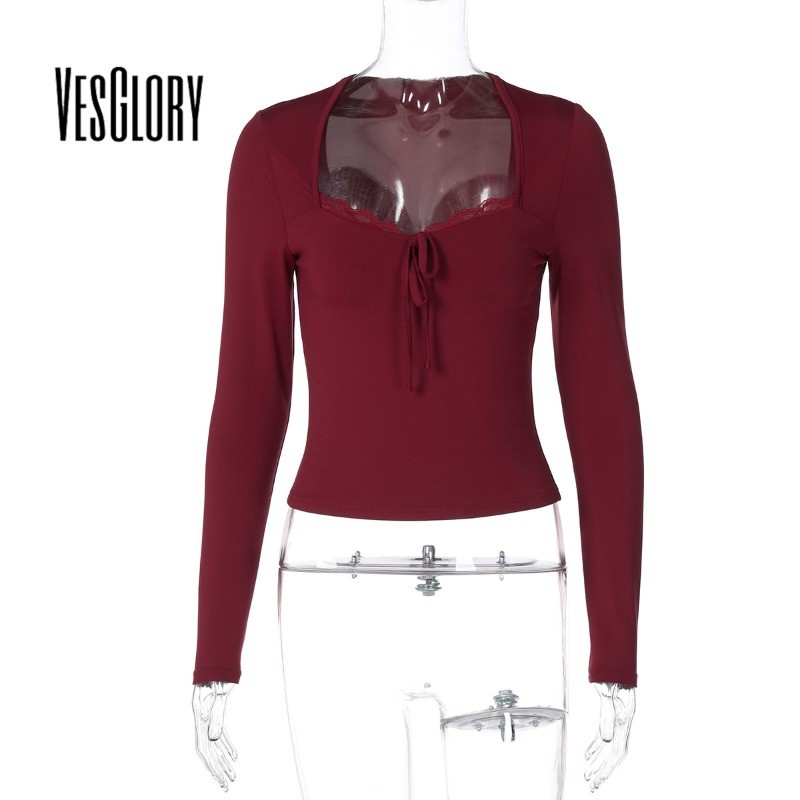 VesGlory Women 2025 Fashion Blouse Square Neck Lace Design Long Sleeve Solid Color Street Wear Style