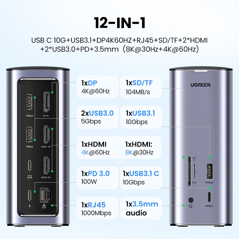 UGREEN 12-IN-1 Docking Station USB C Multiport Adapter with 8K HDMI Gigabit Ethernet, USB 3.1 Hub, SD/TF Card Slot, 100W PD Port, Compatible with Macbook Pro/Air, Laptops, Tablets