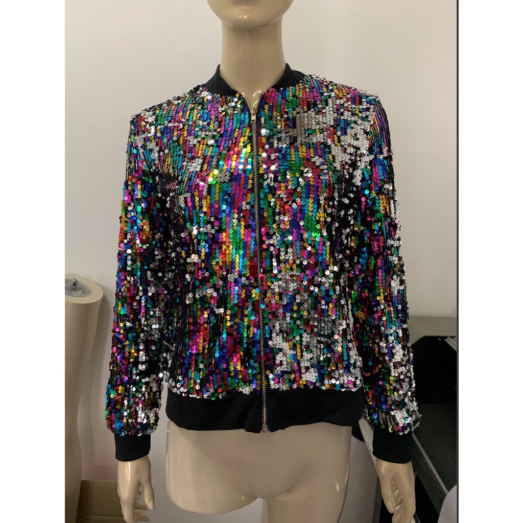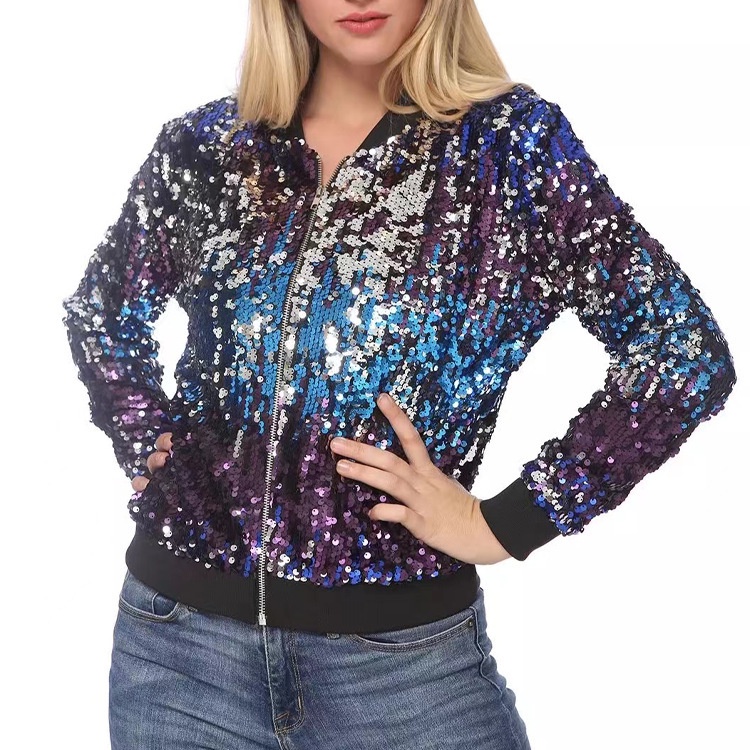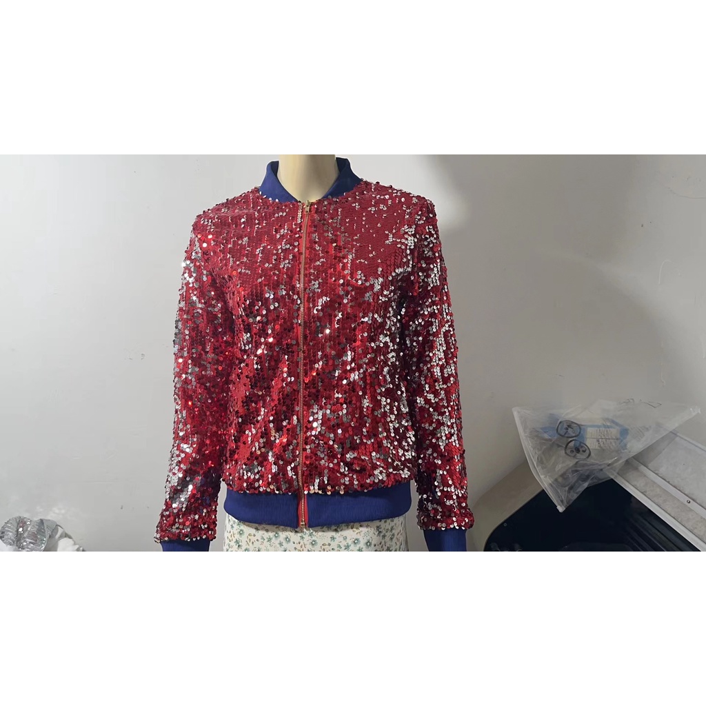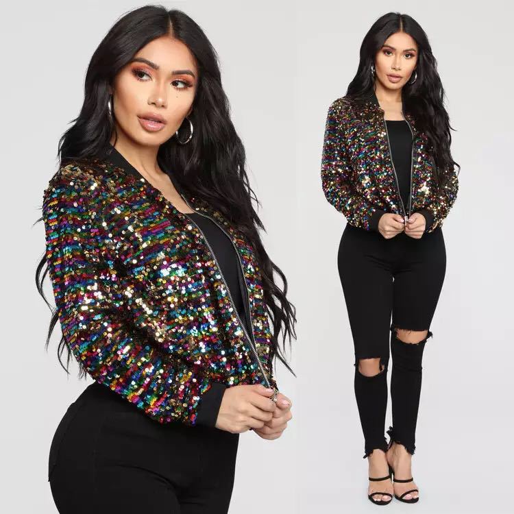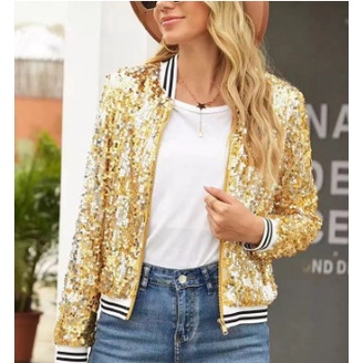 Women Fashion Gold Sequins Bomber Jackets Loose Zippered Short Coat