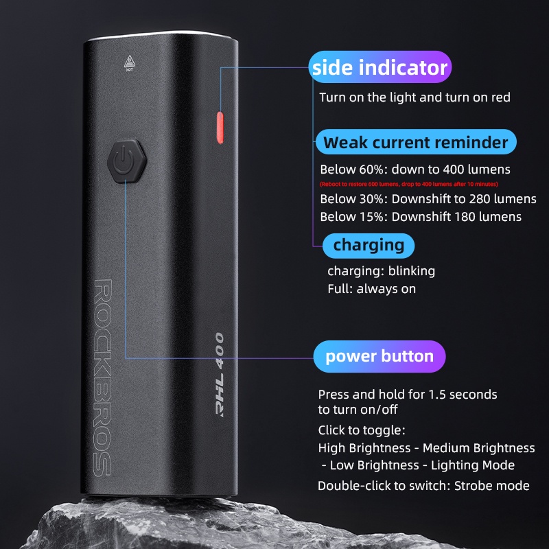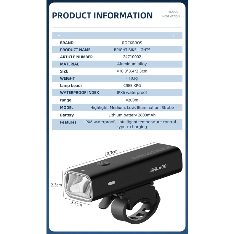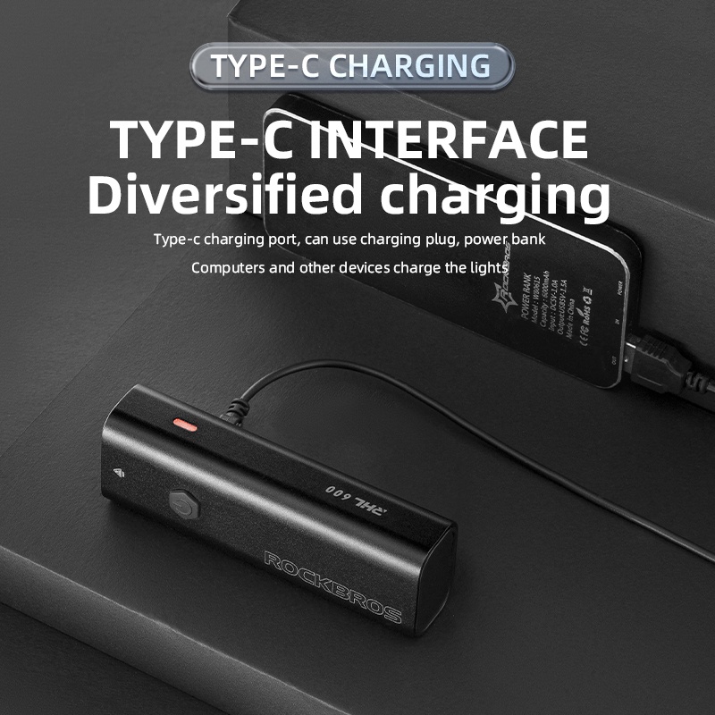 【PH Delivery】ROCKBROS Bicycle Front Light 600 Lumen Ipx6 Waterproof Headlight 5 Models Lamp Intelligent Temperature Control Flashlight Bike Accessories