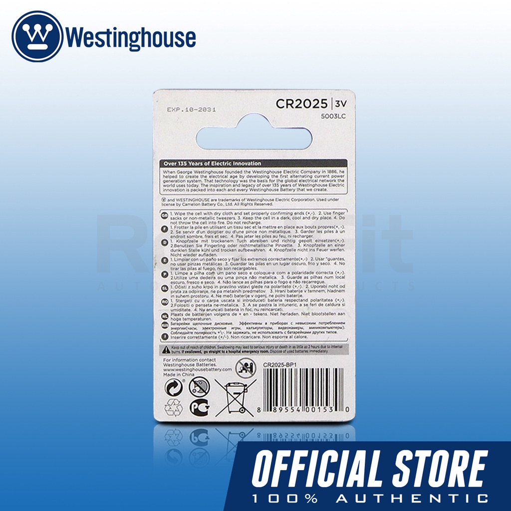 Westinghouse Lithium Coin Battery 3V Coin Cell ANSI 5003LC, 1 Piece Per Pack CR2025-BP1(Outlet)