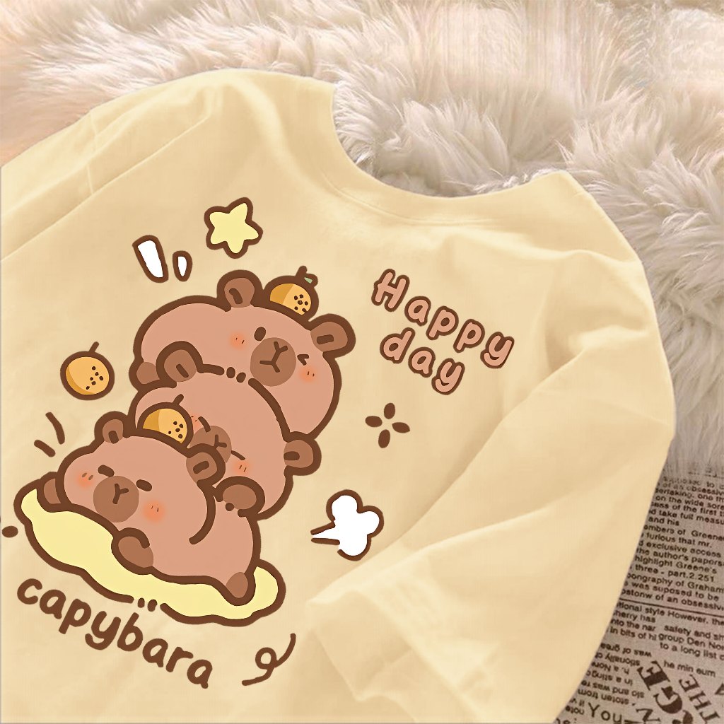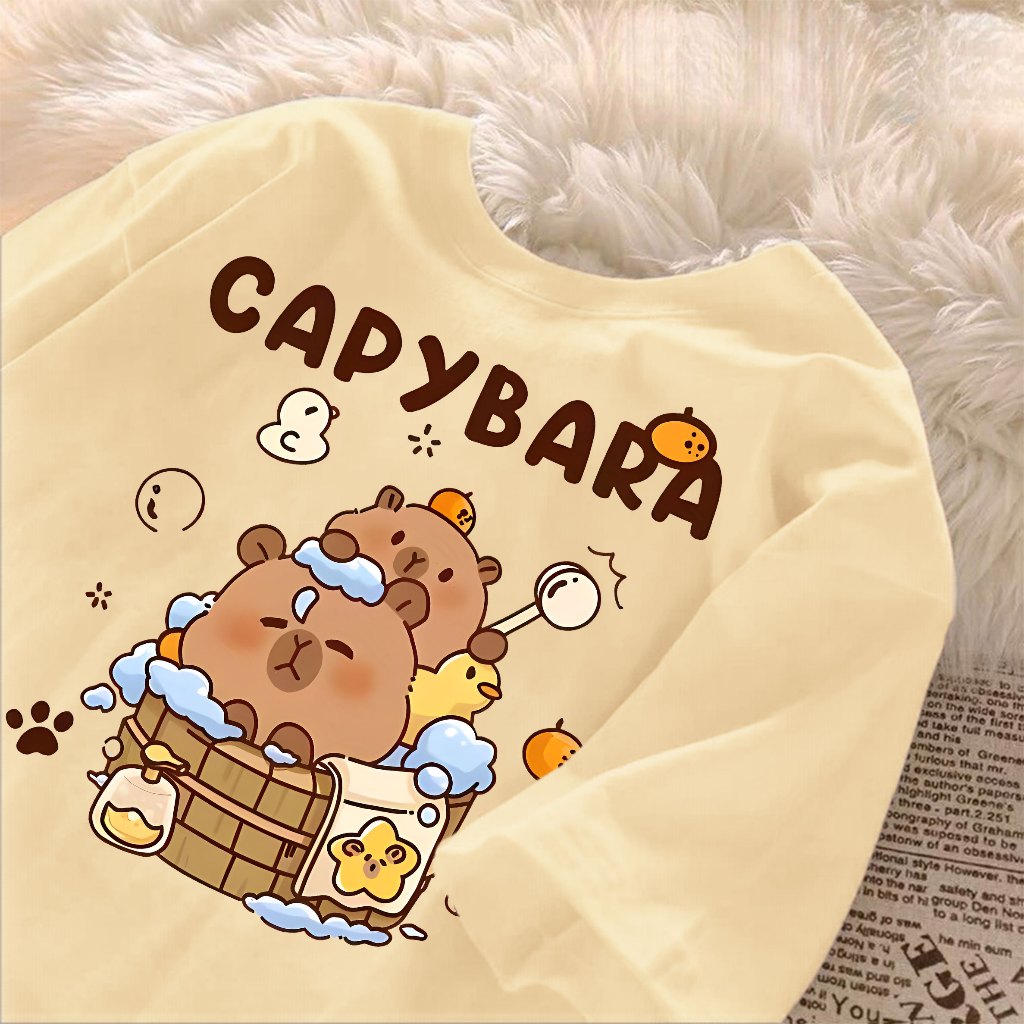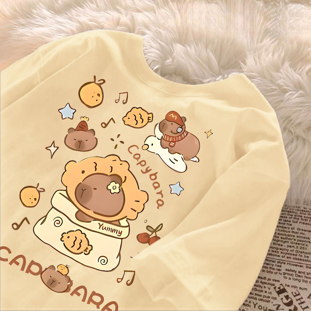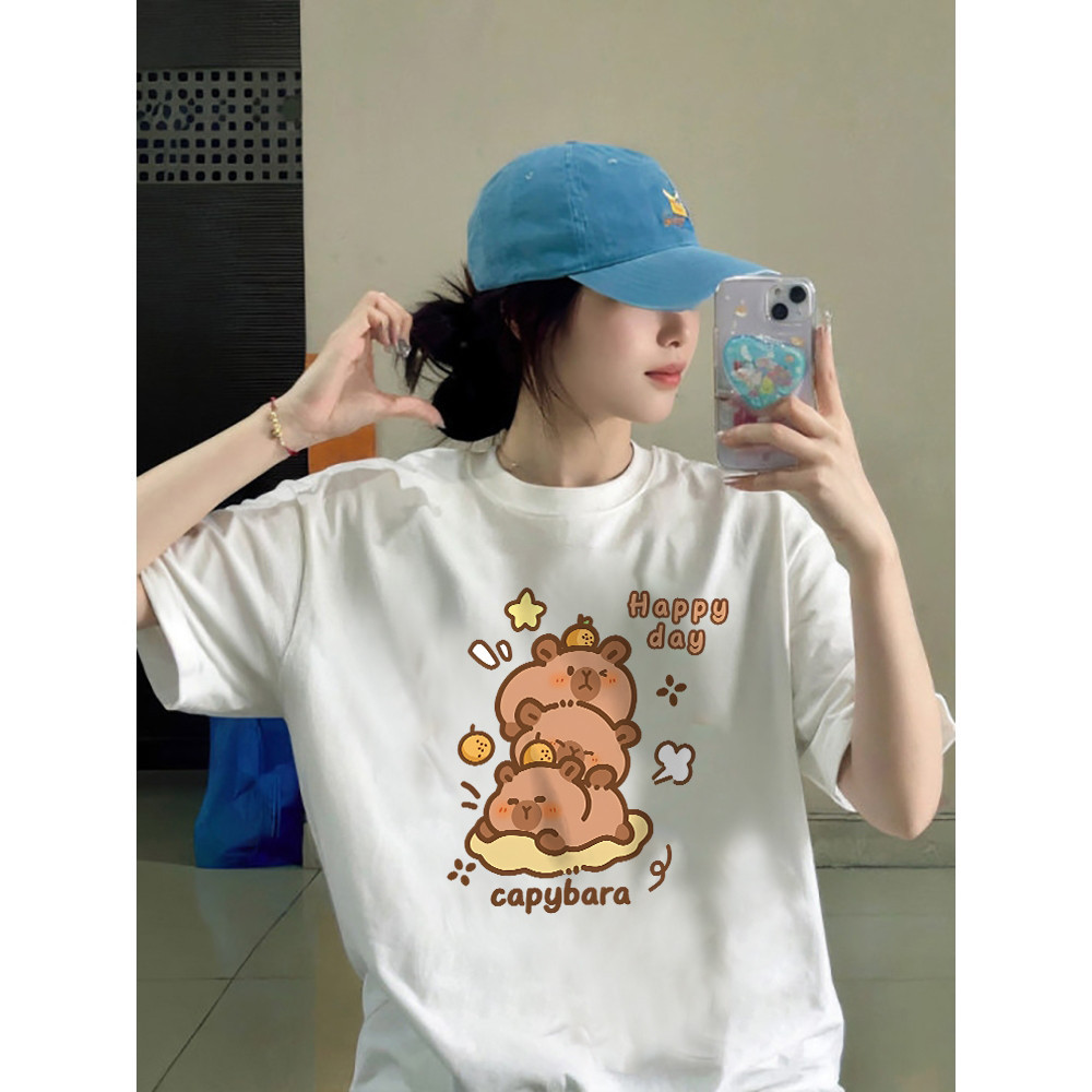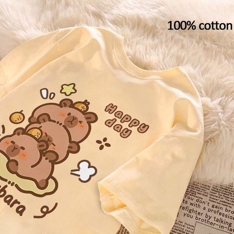 【220G 100%Cotton】SISI Korean retro cute capybara print oversized Apricot Wild T-shirt for women#I481