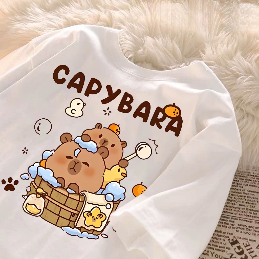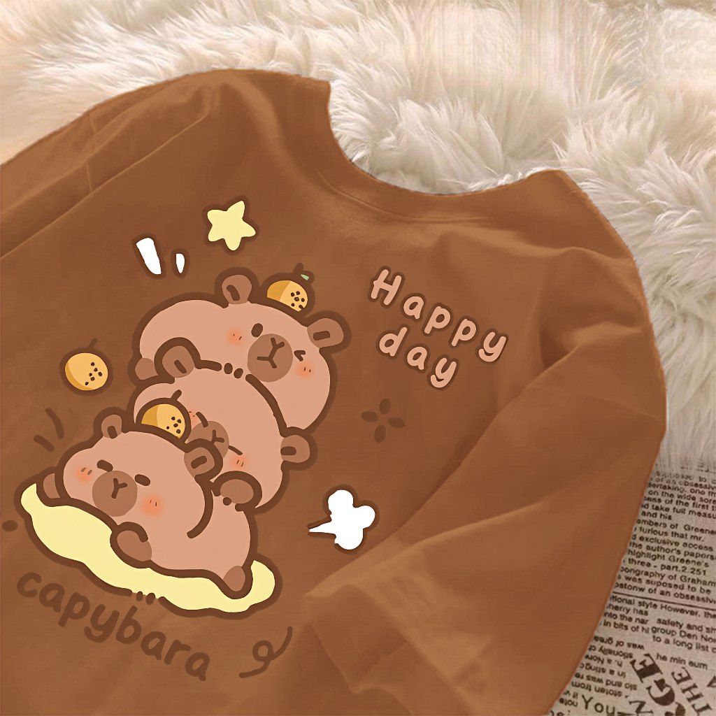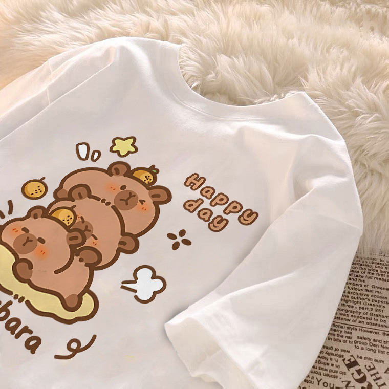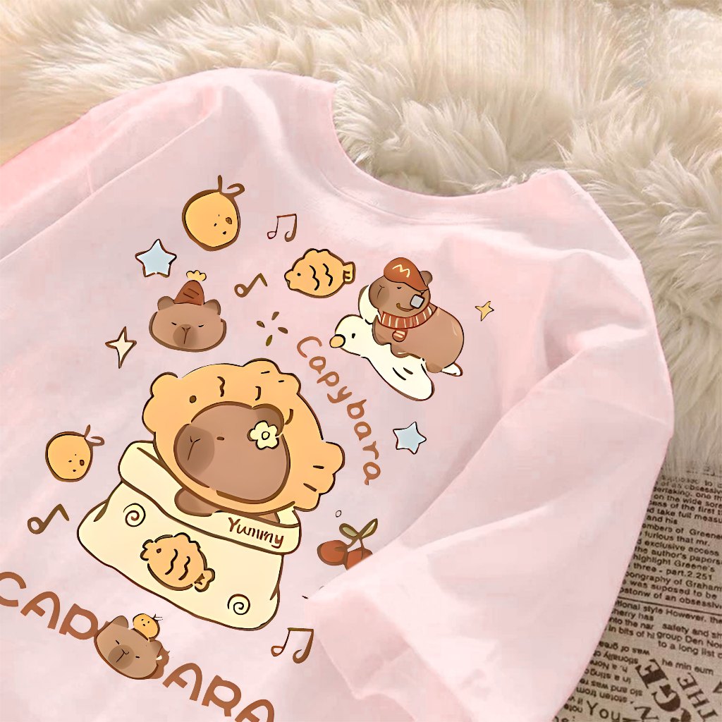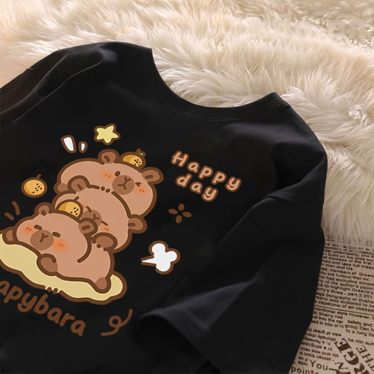 【220G 100%Cotton】SISI Korean retro cute capybara print oversized Apricot Wild T-shirt for women#I481