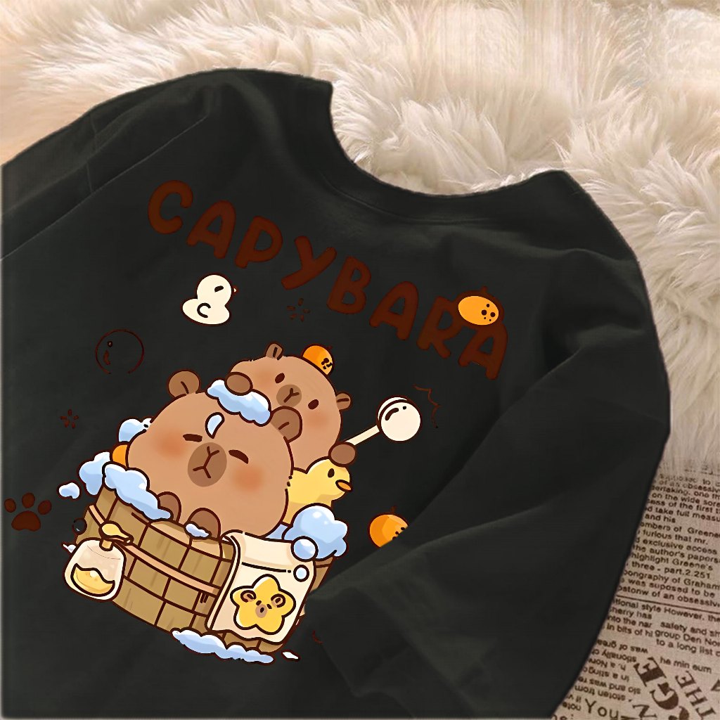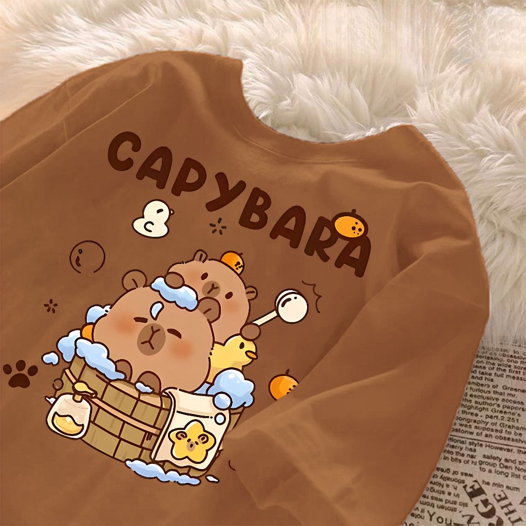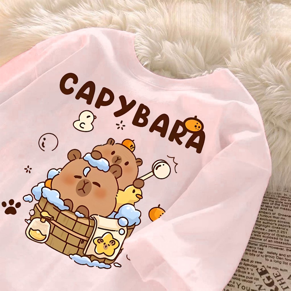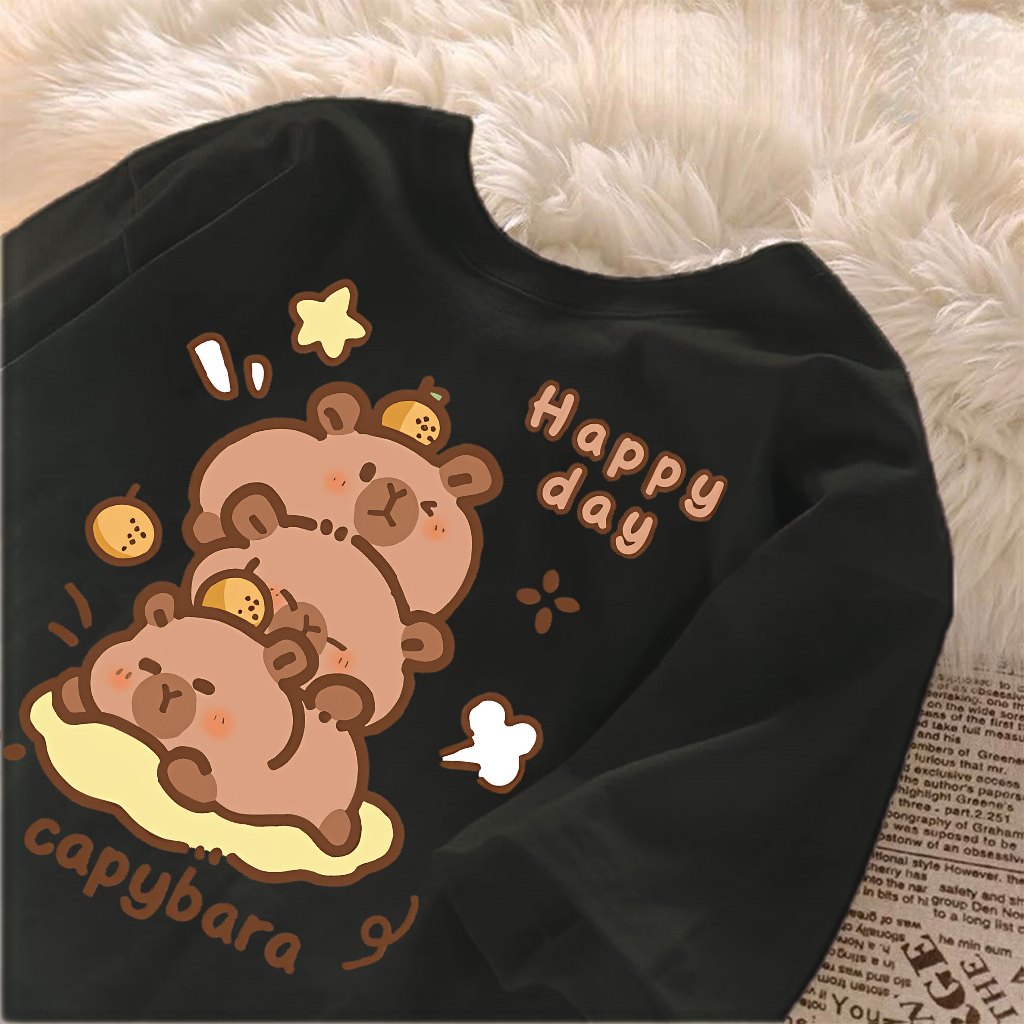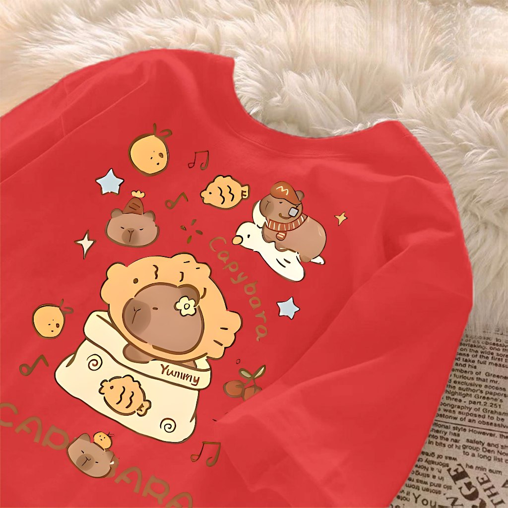 【220G 100%Cotton】SISI Korean retro cute capybara print oversized Apricot Wild T-shirt for women#I481