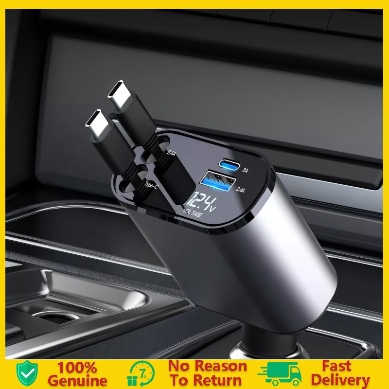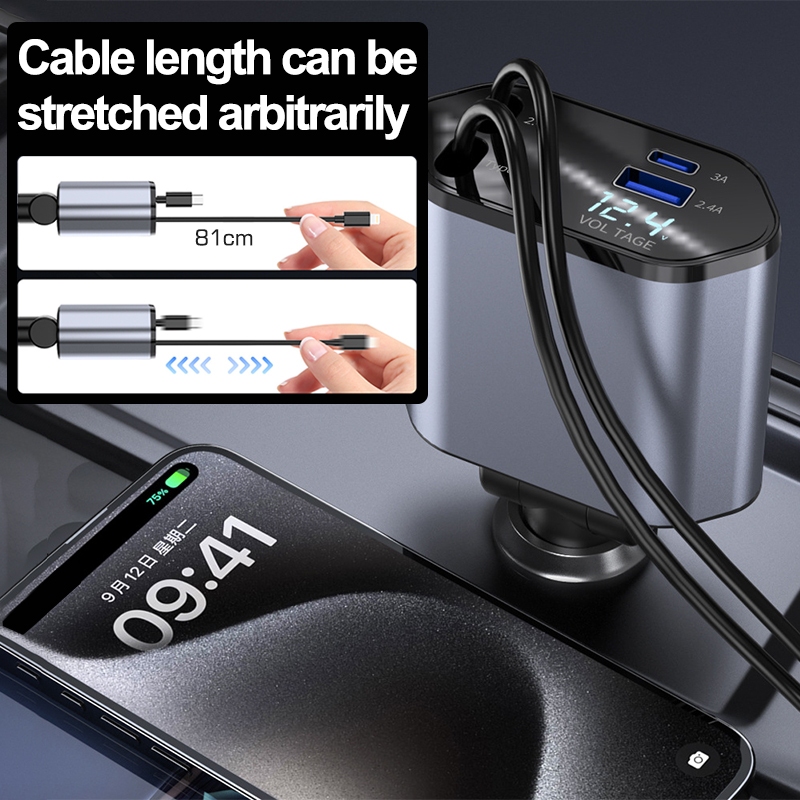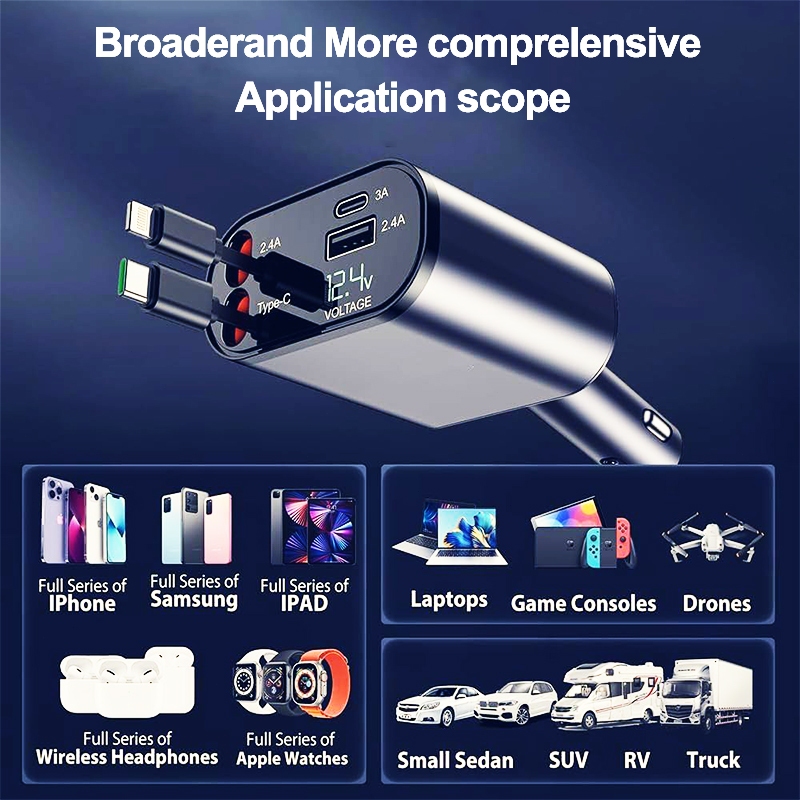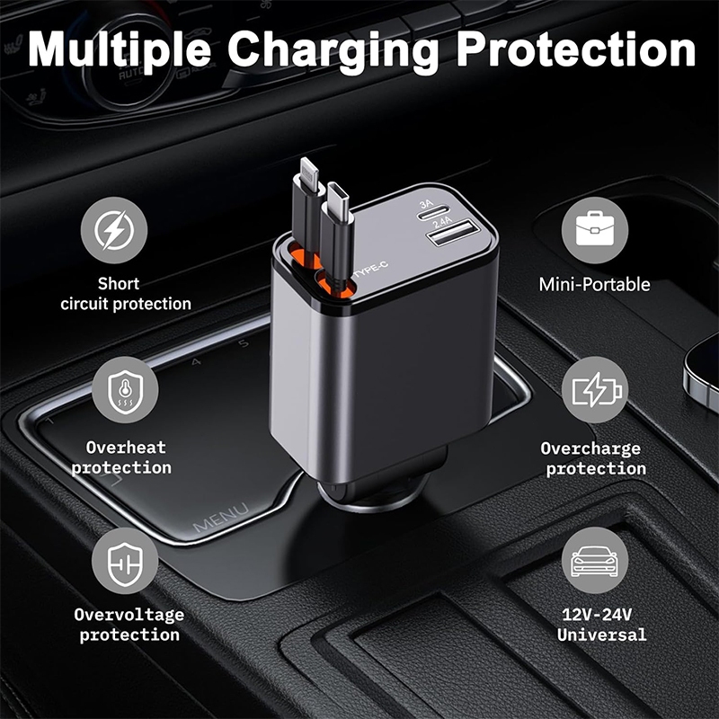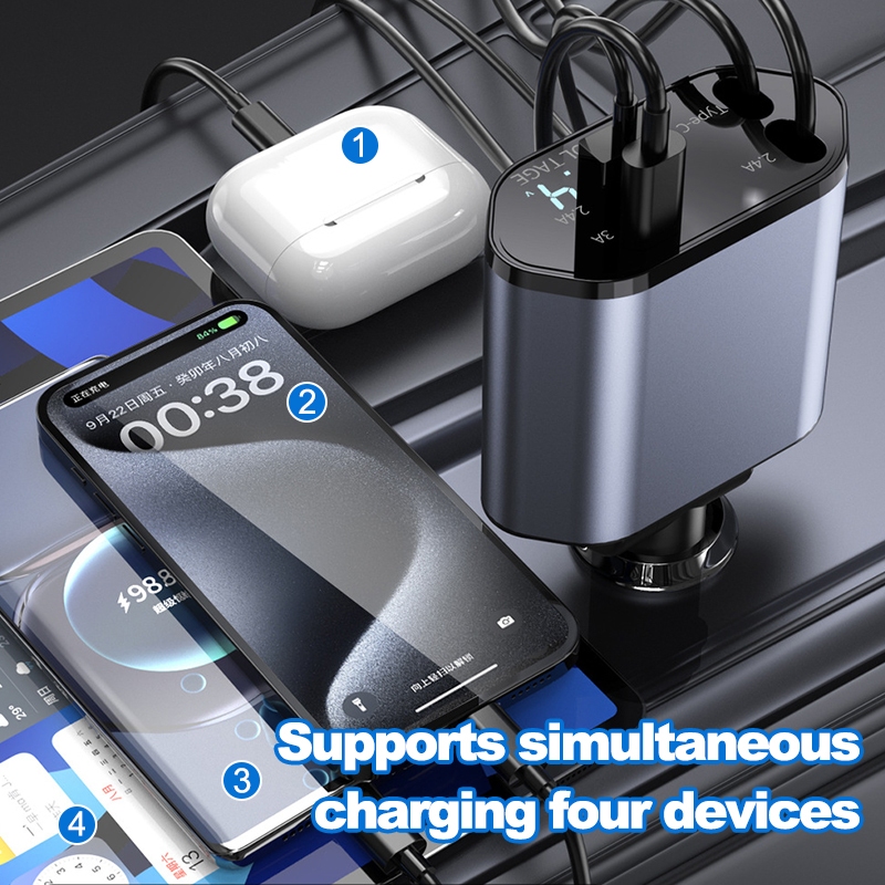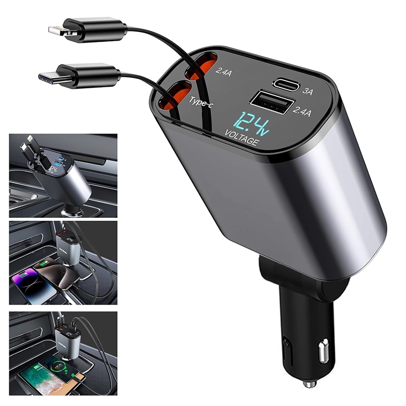 Four-In-One Quick Charger with Retractable Cable Type C and IOS USB Car Charger Quick Charge Plug