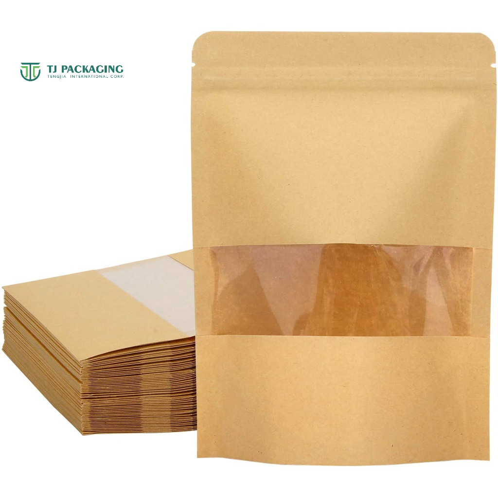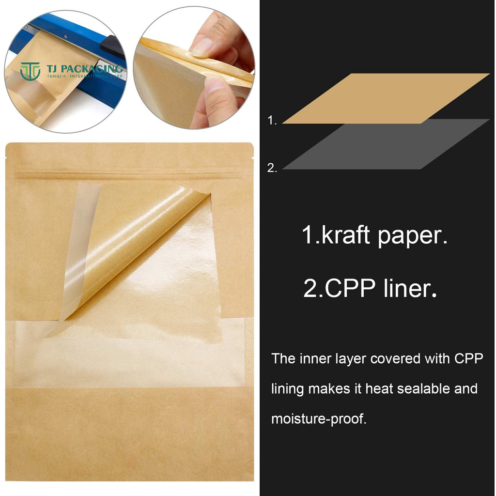 (50pcs) Kraft Stand Up ZipLock Pouch Brown Resealable Bag with Clear Window and Tear Notch for food