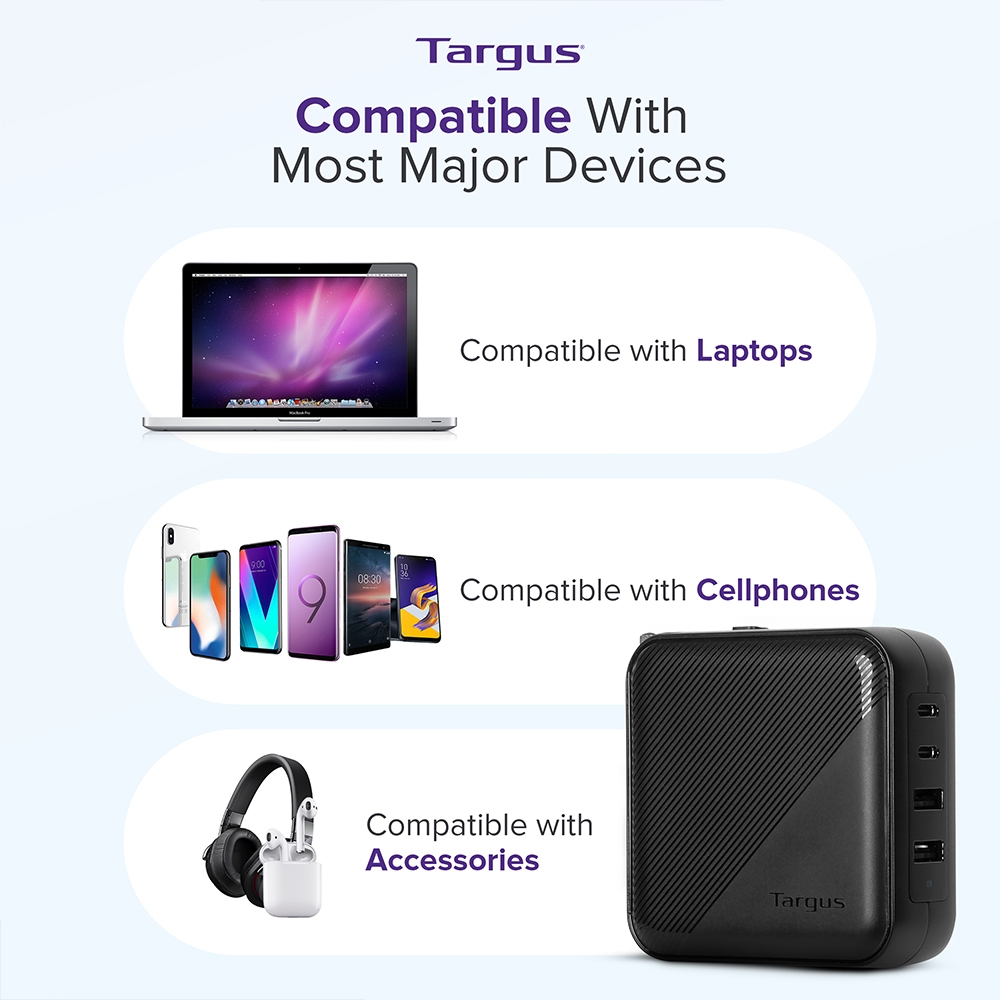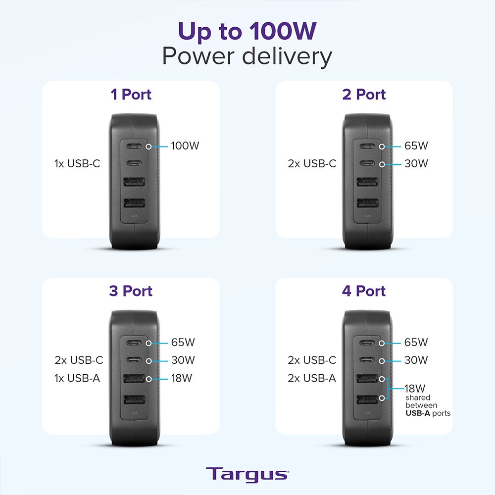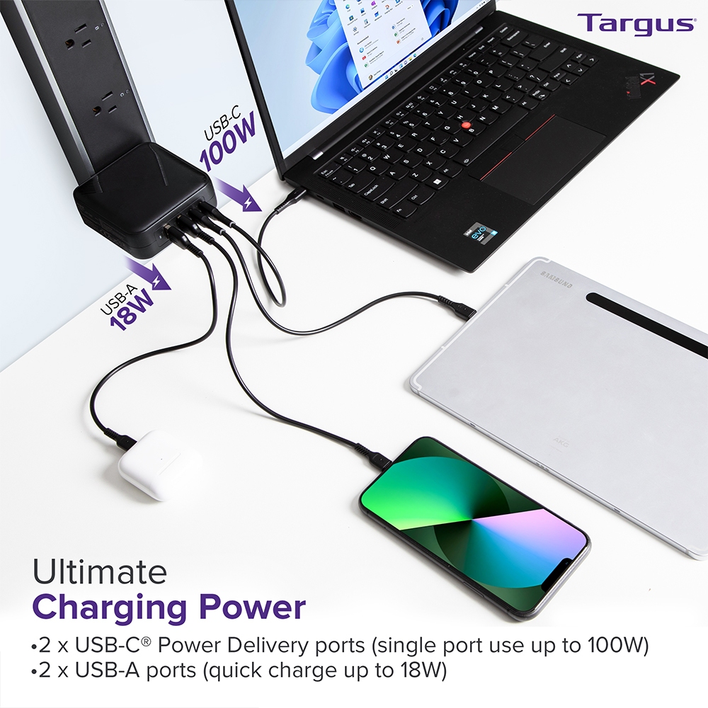 Targus PowerElite 100W GaN Wall Charger with Multiple Device Charging for Laptop and Phone