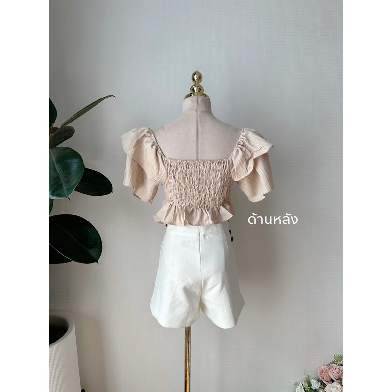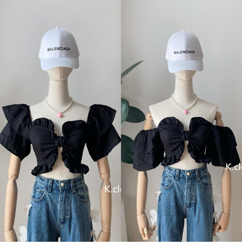 Front Bow Crop Top Ruffled Sleeves