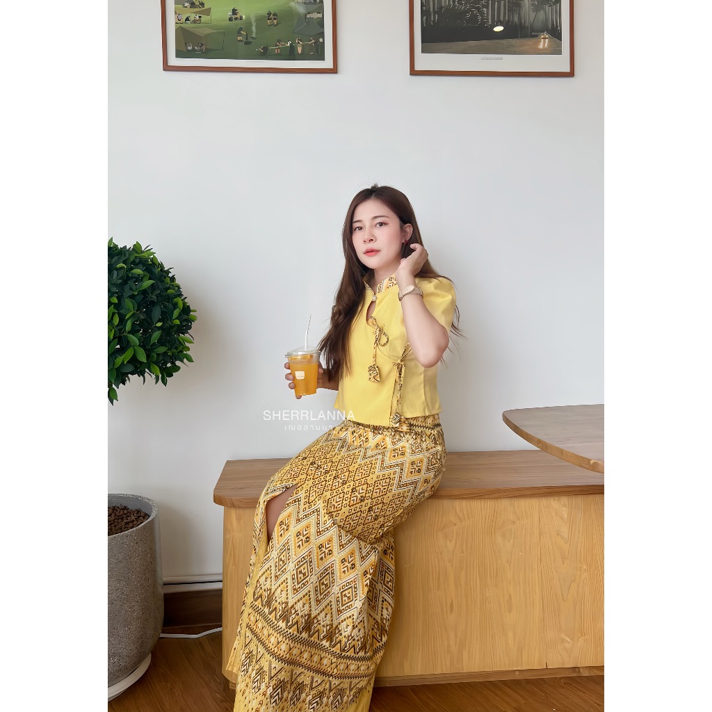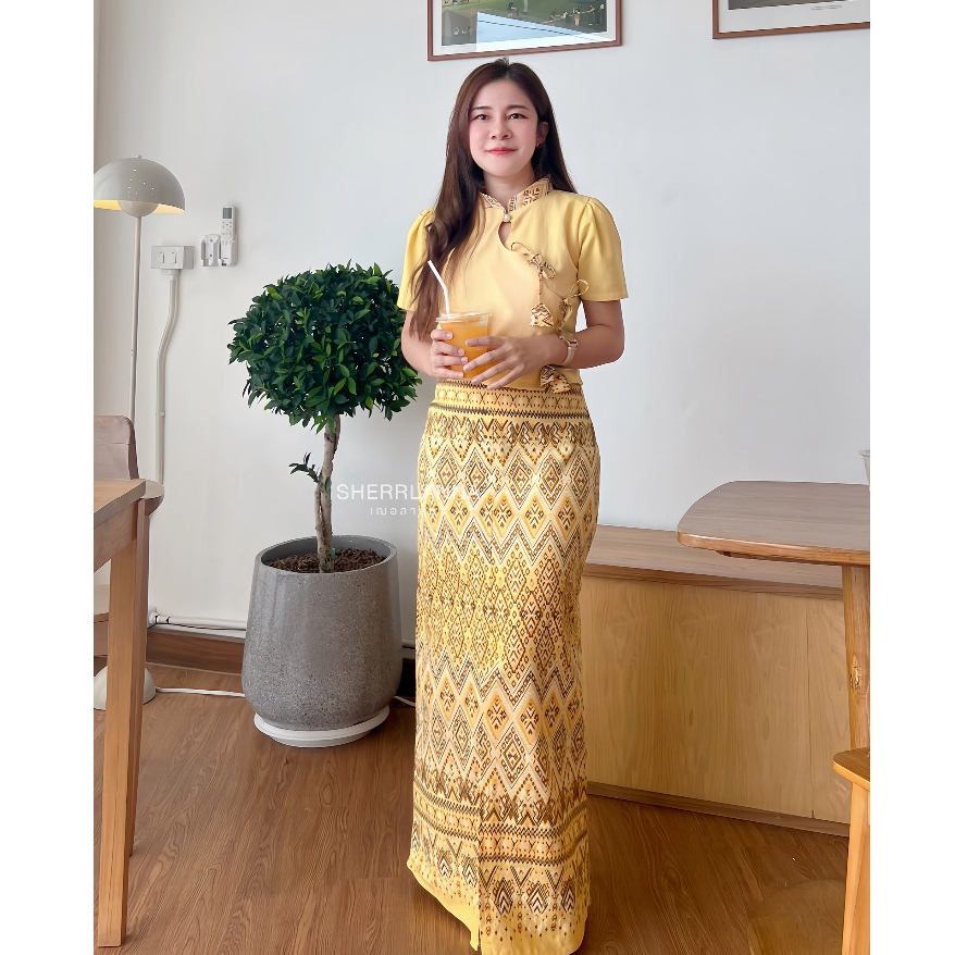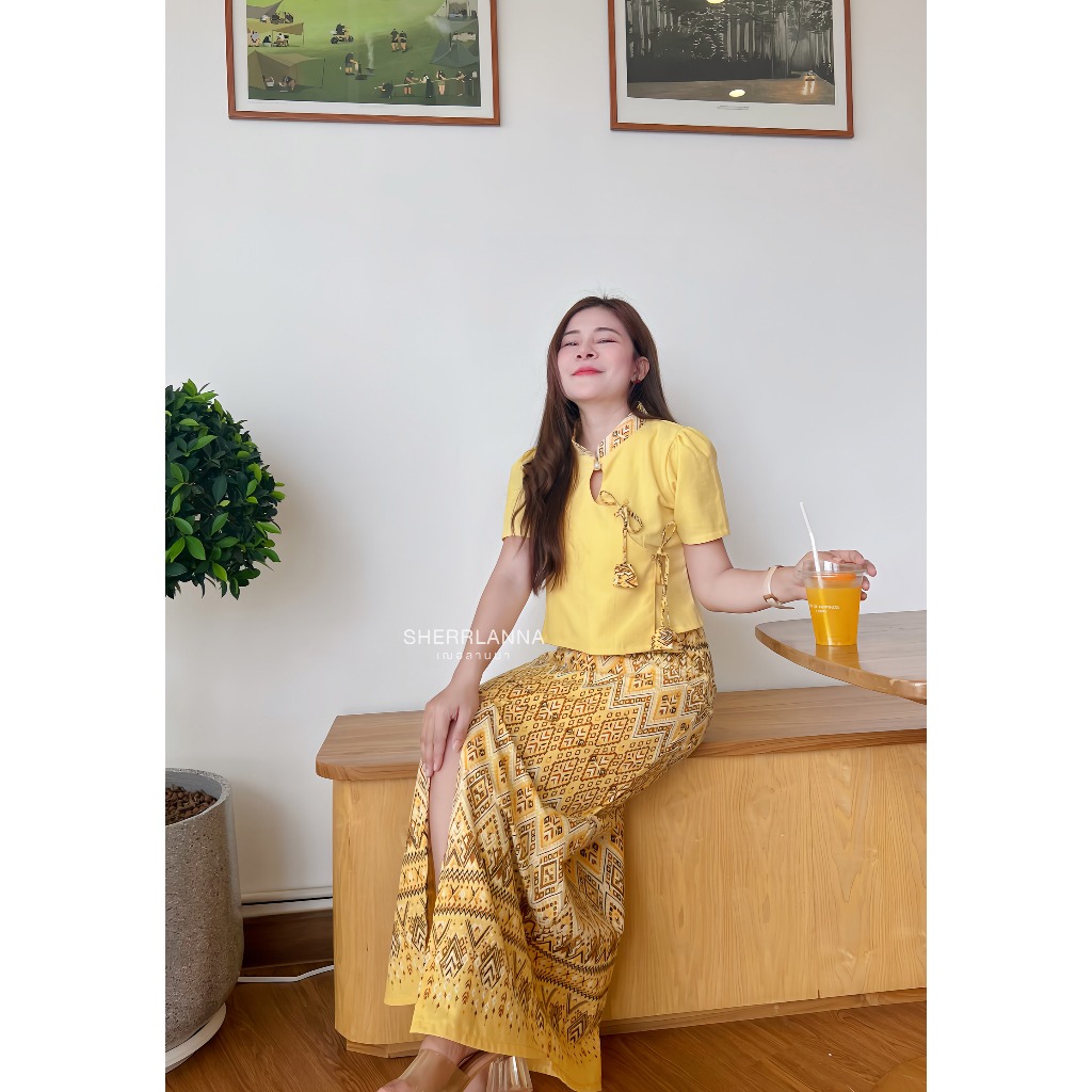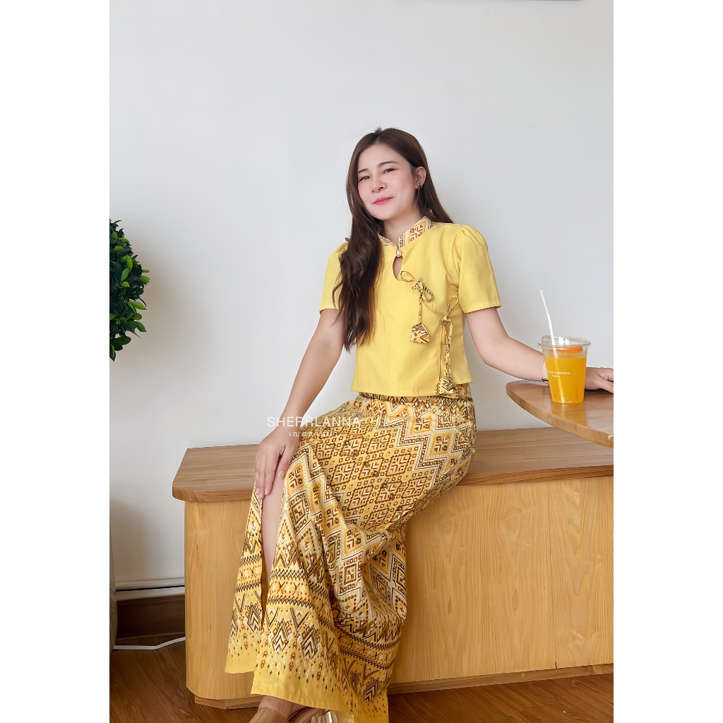 Set Of Chinese Collar Shirt With A Bow Tie At The Chest Thai Pattern Front Slit Skirt