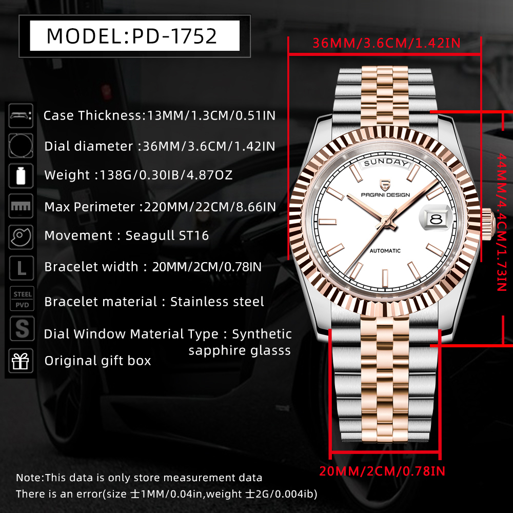 PAGANI DESIGN Men Watch New Rose Gold DD36 Mechanical Automatic Sapphire Glass Waterproof 316L Stainless Steel Watch For Men PD-1752