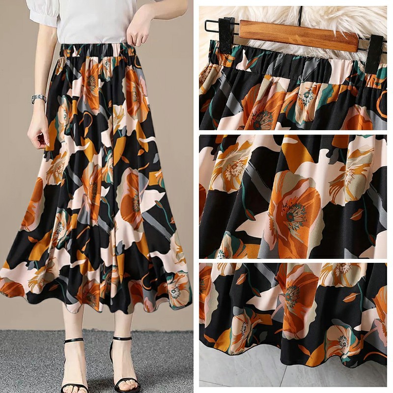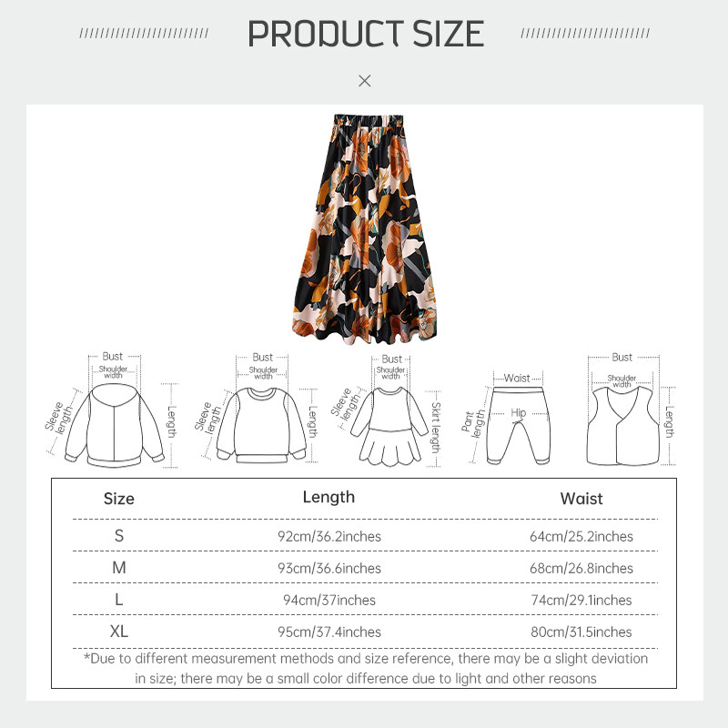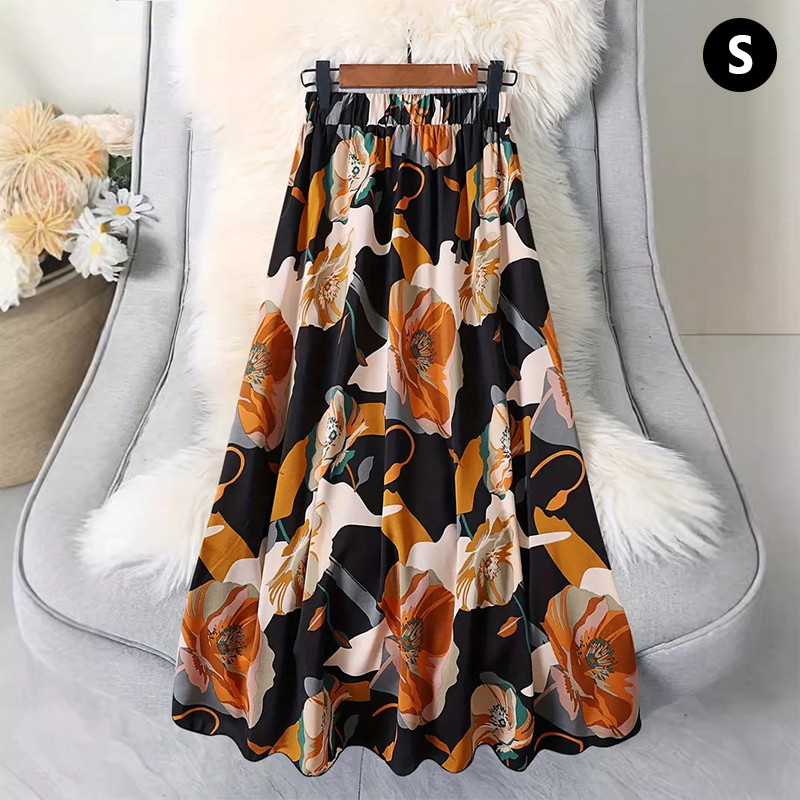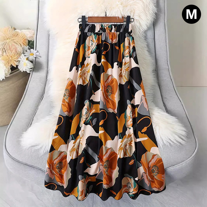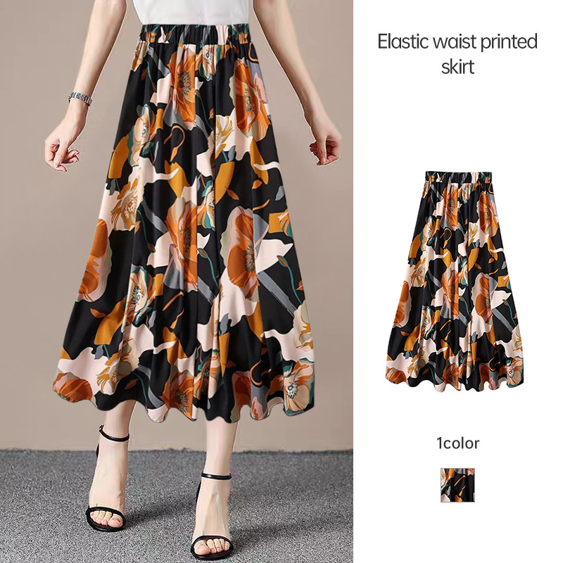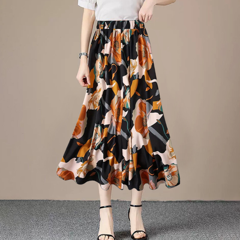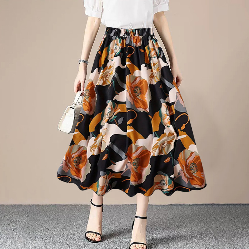 Women A-line Large Hem Skirt Commuting Versatile Long Skirt Elastic Waist Printed Skirt SR