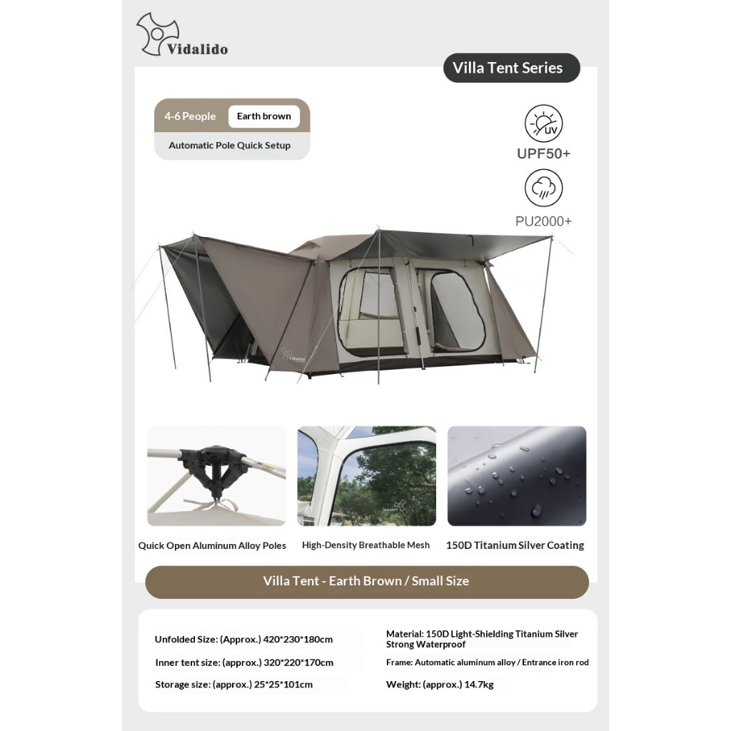 Vidalido VICORE Automatic Tent Villa Cabin Style 4-8 Person Small Large 11m² Waterproof 2 Bedroom