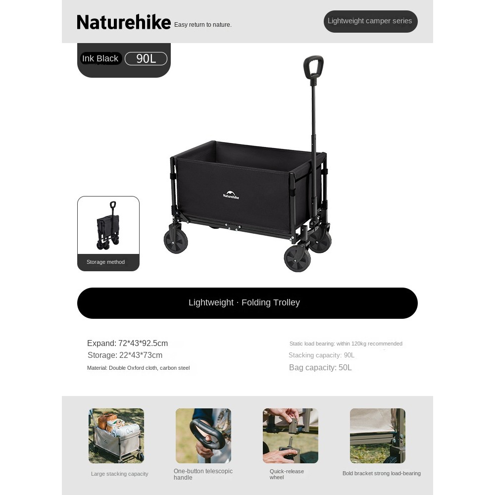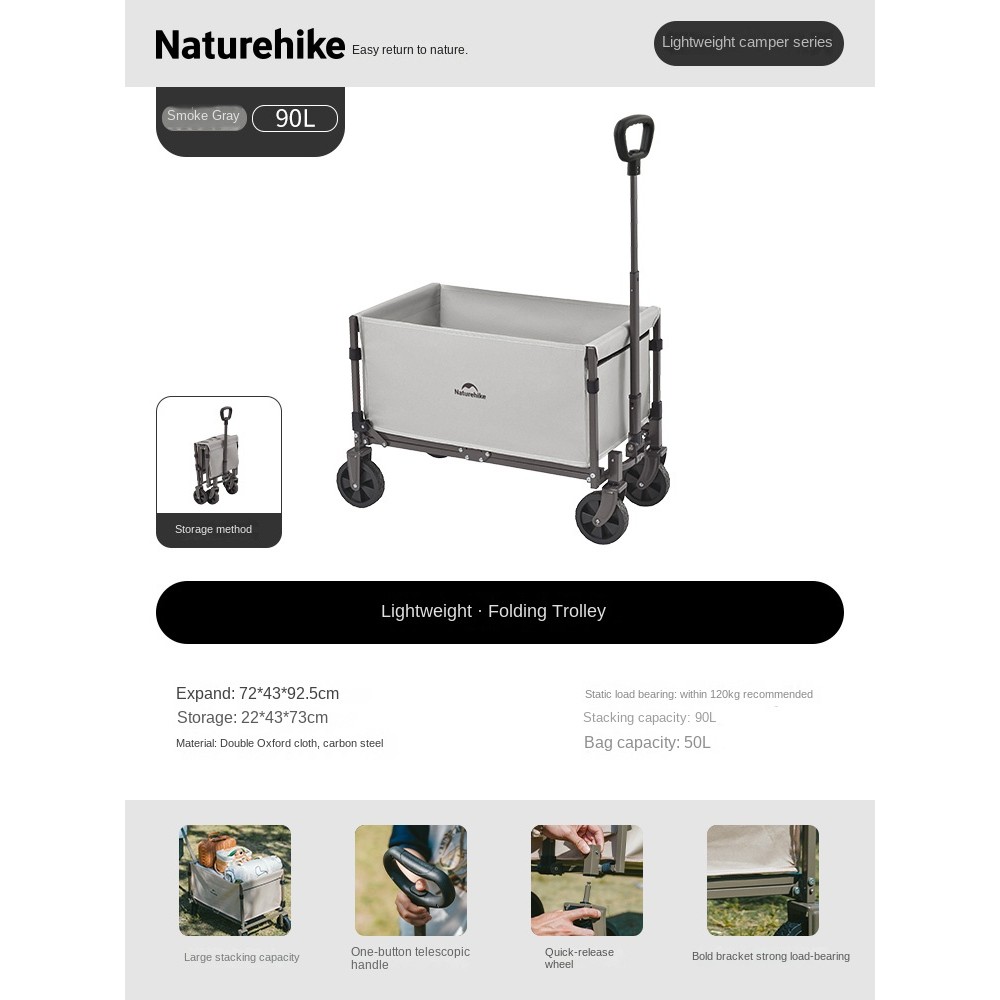 Naturehike Mini Foldable Trolley Cart 50/70L Capacity Utility Wagon Carrier Push Cart Outdoor