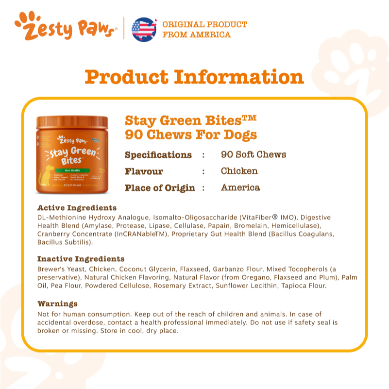 Zesty Paws Stay Green Bites for Dogs Gut Health - Chicken Flavor (90 Soft Chews) (EXP:07 2026)