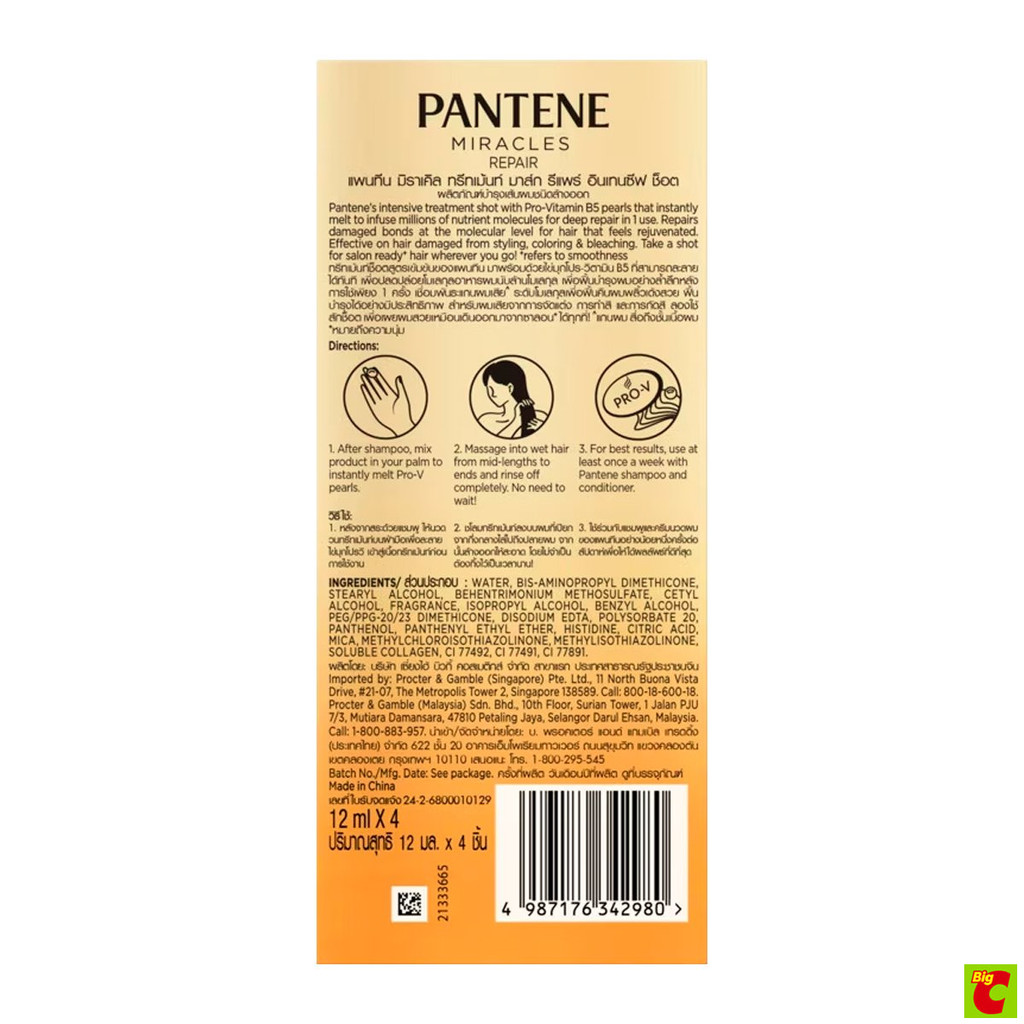 Pantene Miracle Treatment Mask Repair Intensive Shot 12 Ml. x 4 Pieces Hair Mask