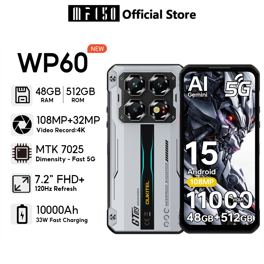 OUKITEL WP60 5G 48GB+512GB 7.2“ FHD+ 120Hz Resfersh Rate Display 108MP+32MP 5G cellphone 10000mAh Handphone Mobiles Camera Android 15