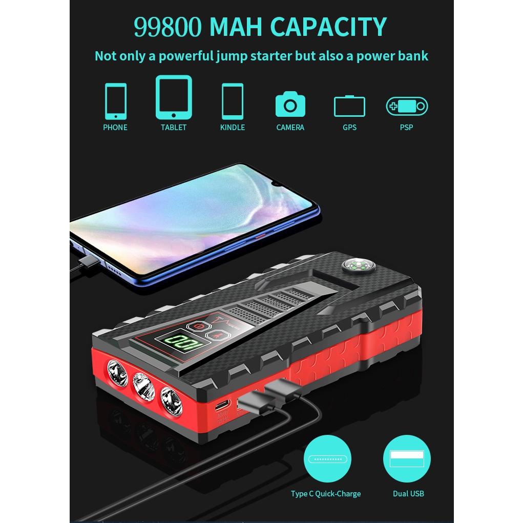 99800mAh Car Power bank High power With Pump Power Bank Car Jump Start Emergency Light