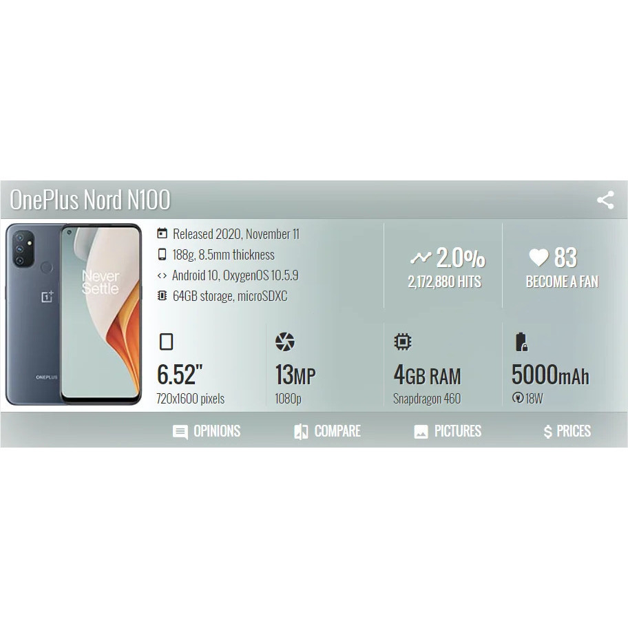 Oneplus Nord N100 4G 6.52inch Battery capacity 5000mAh CPU Snapdragon 460 13MP Camera used Smartphone QH6R