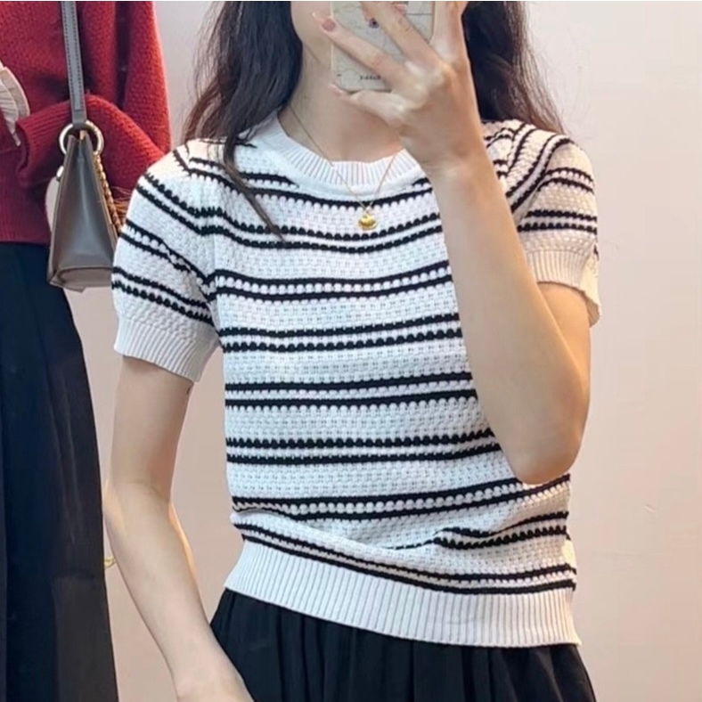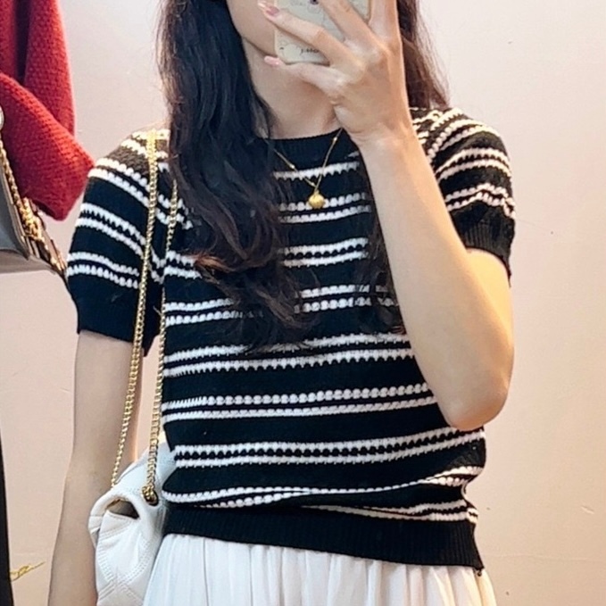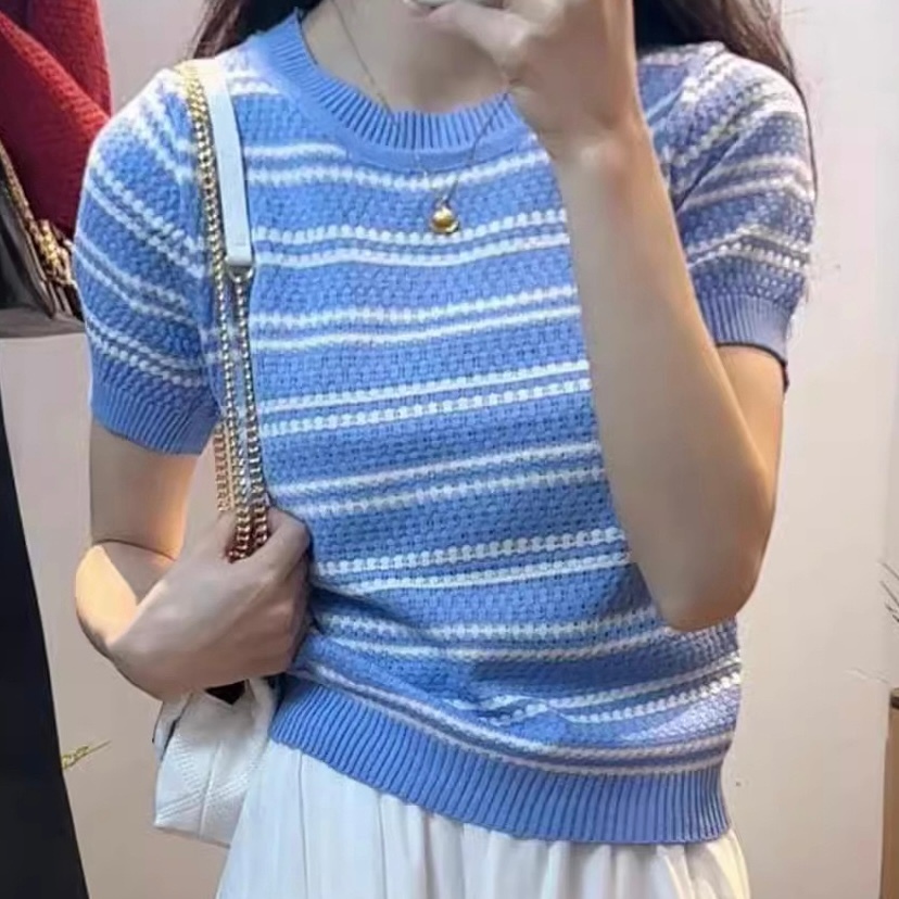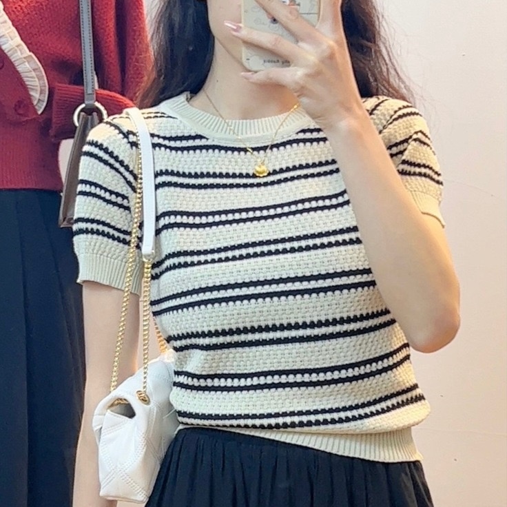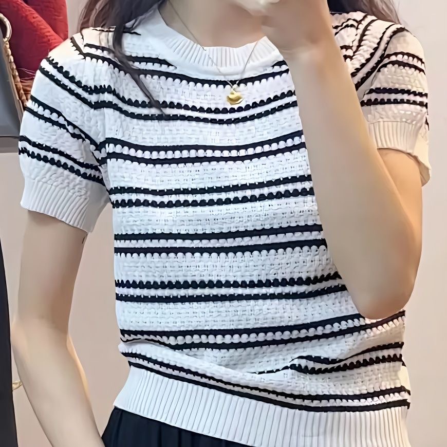 Jolly Chic Stripe Knitted Round Neck Short Sleeve Top M1219