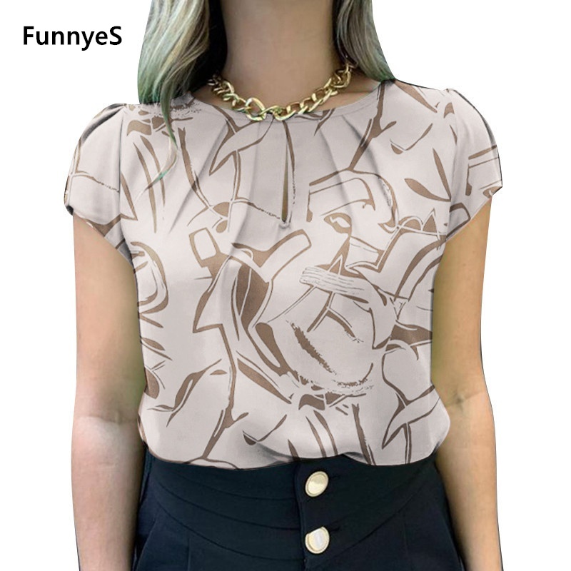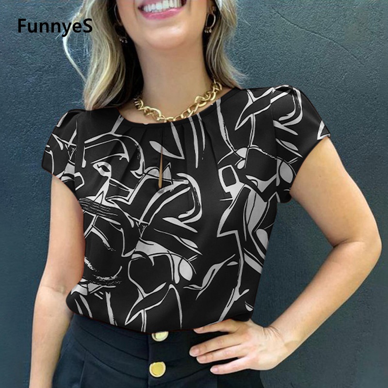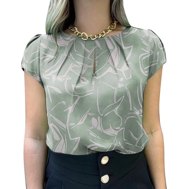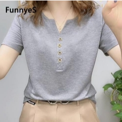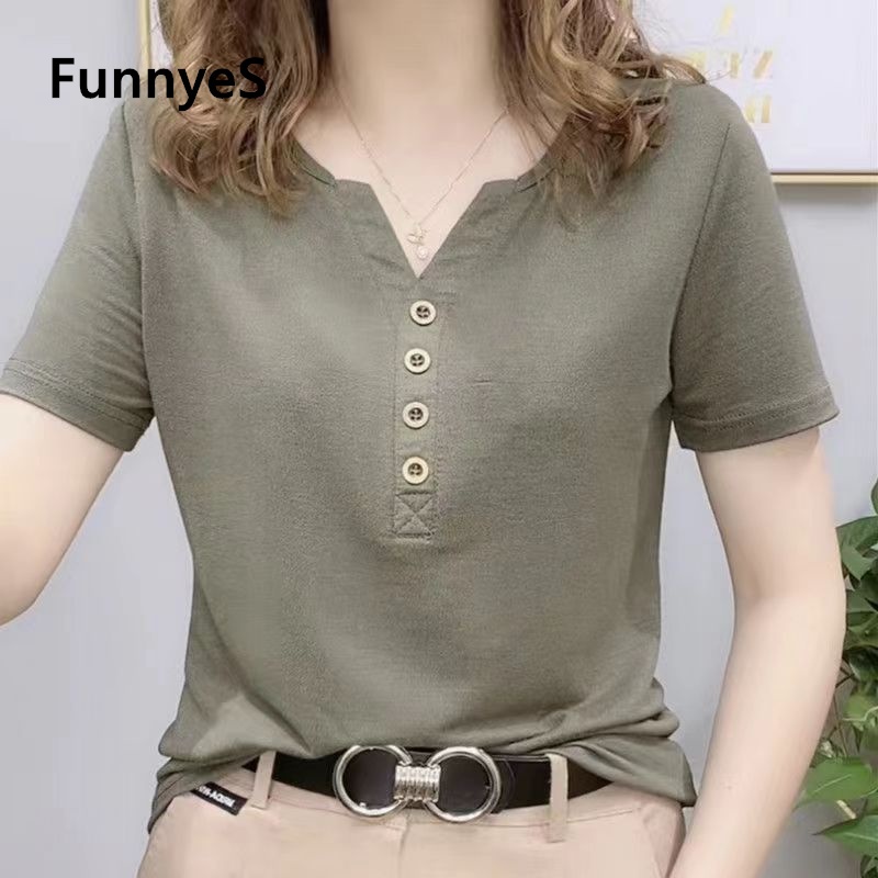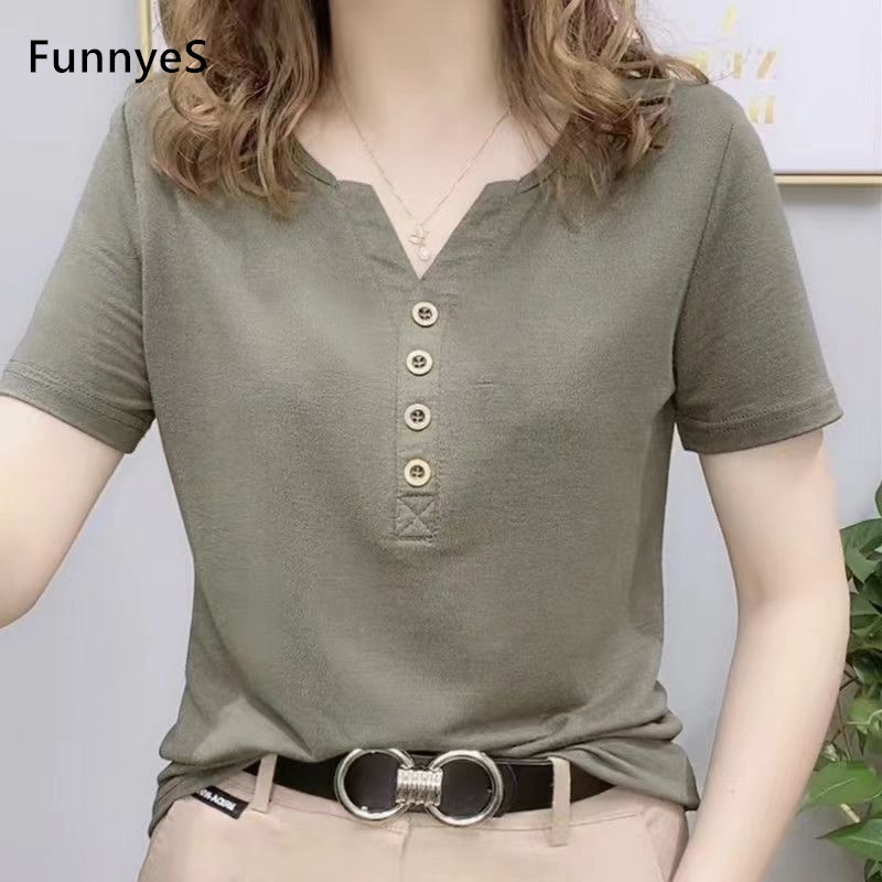 Cotton Blouse T-shirt Women's Short-sleeved Loose Button V-neck Top