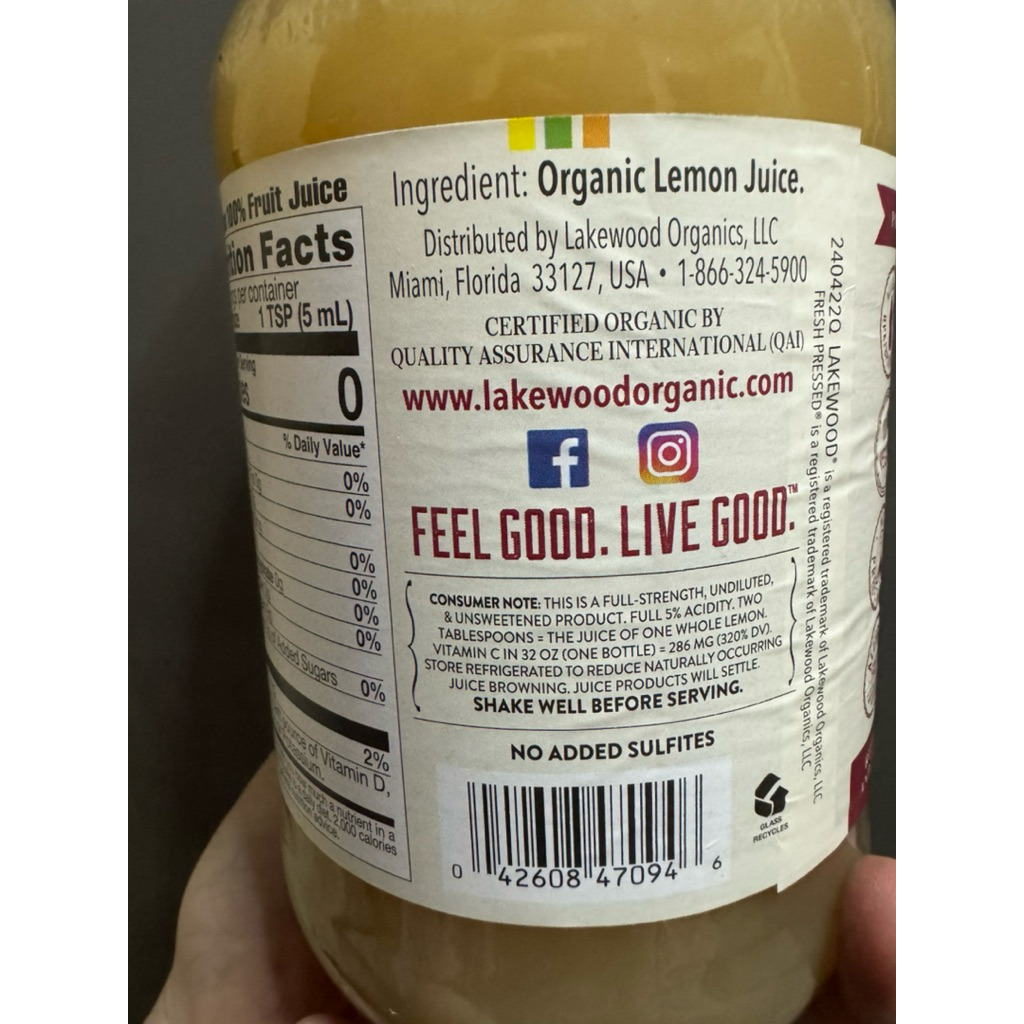 Lakewood Organic Pure Lemon (Fresh Pressed) 32oz or 946ml USDA