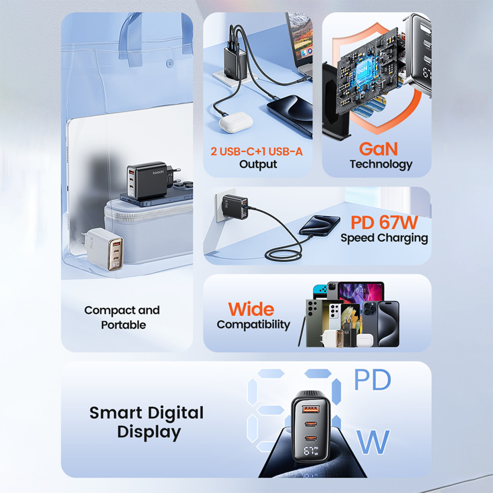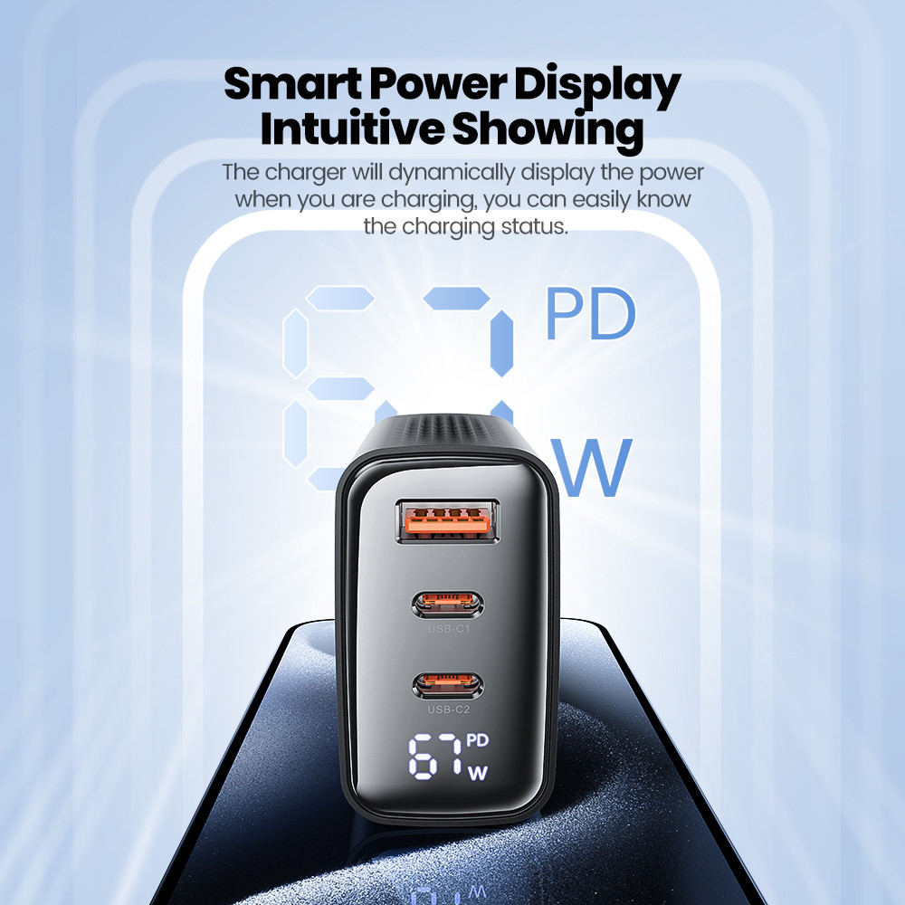 Toocki 67W GAN Charger Fast Charging Three Port PD Charger Type C USB Digital Display Adapter
