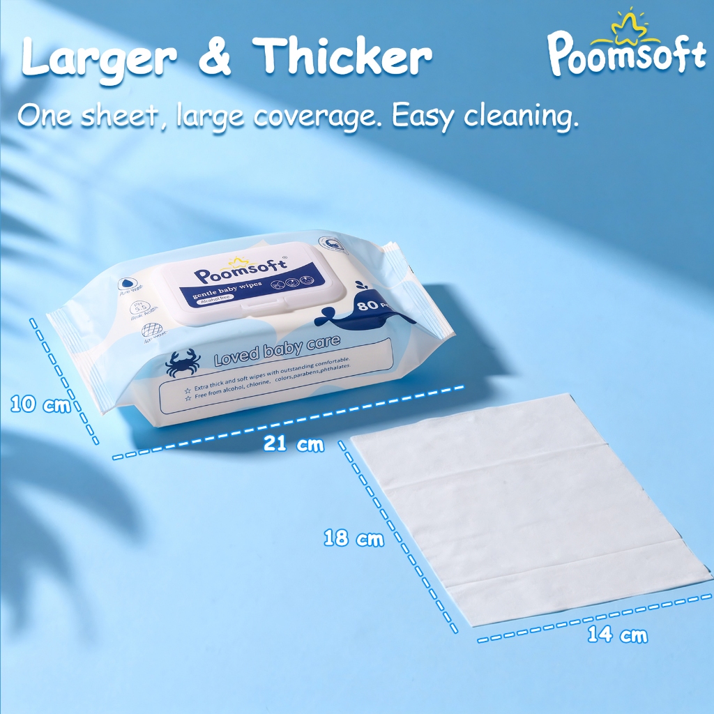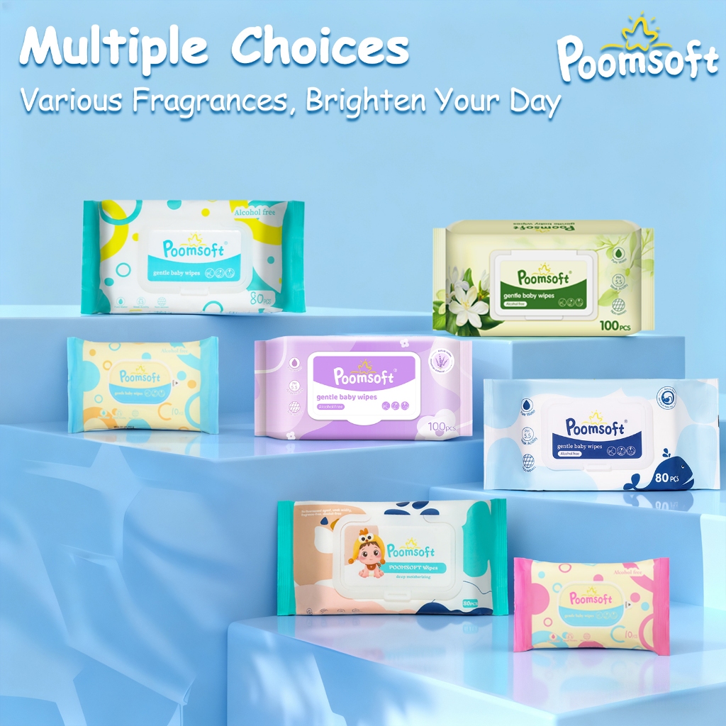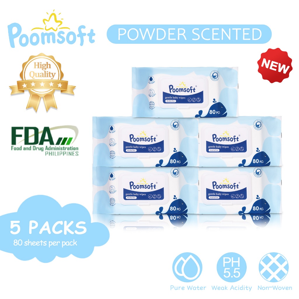 Poomsoft 5 Packs x 80 Sheet Powder Scented No-Alcohol Gentle Wipes For Baby Disposable Wet Wipes