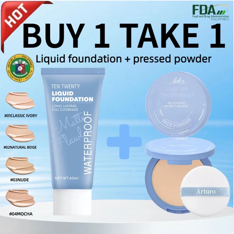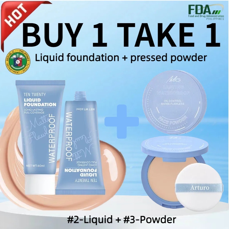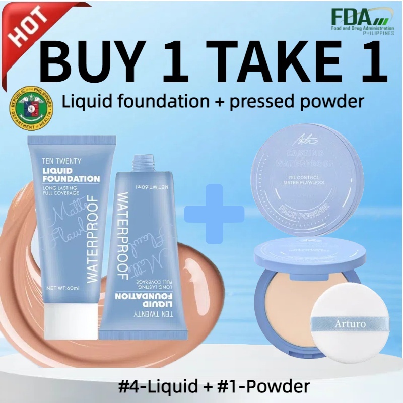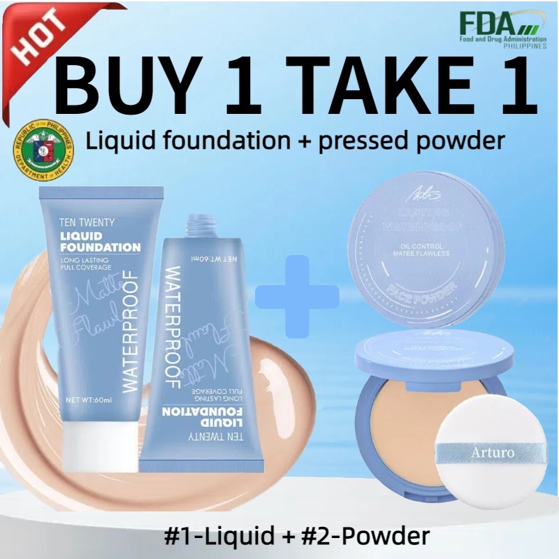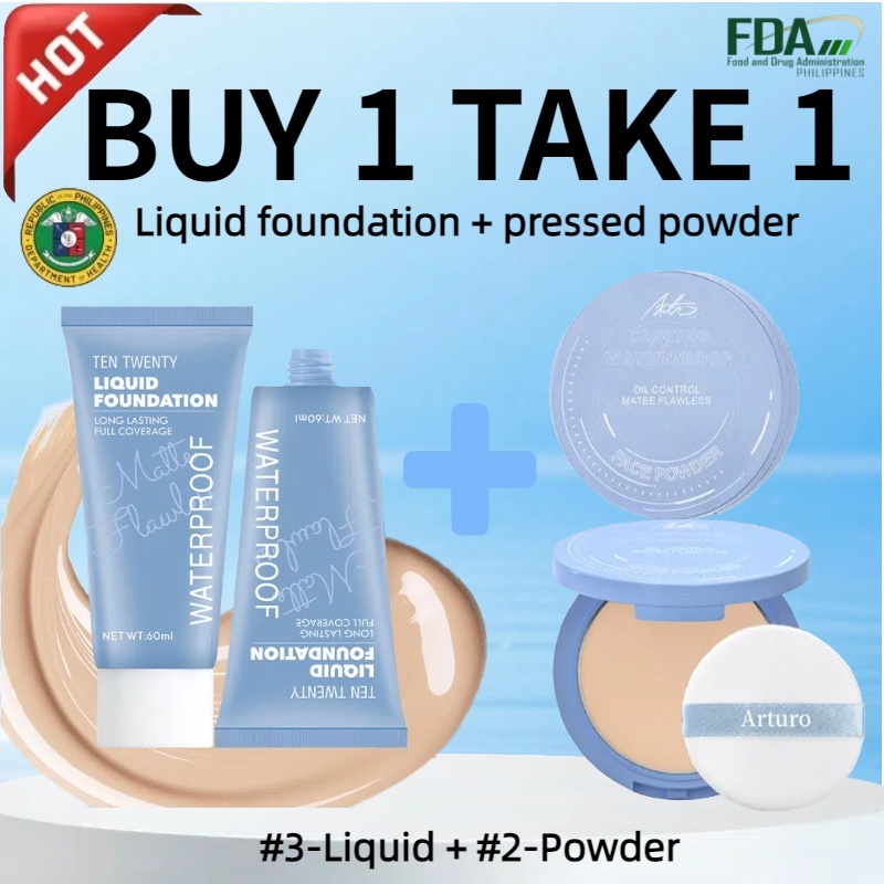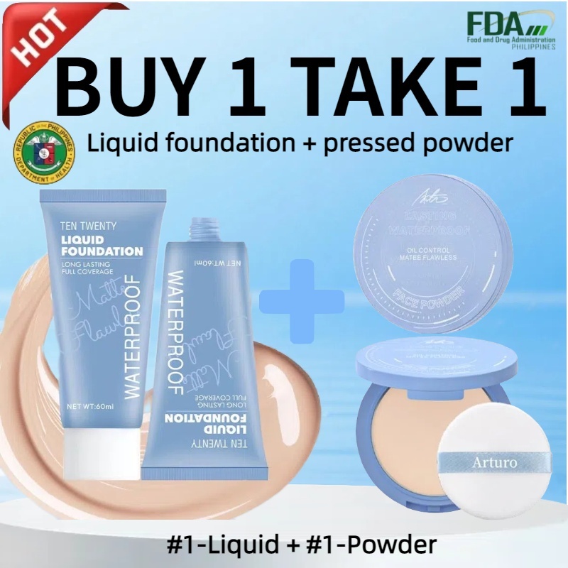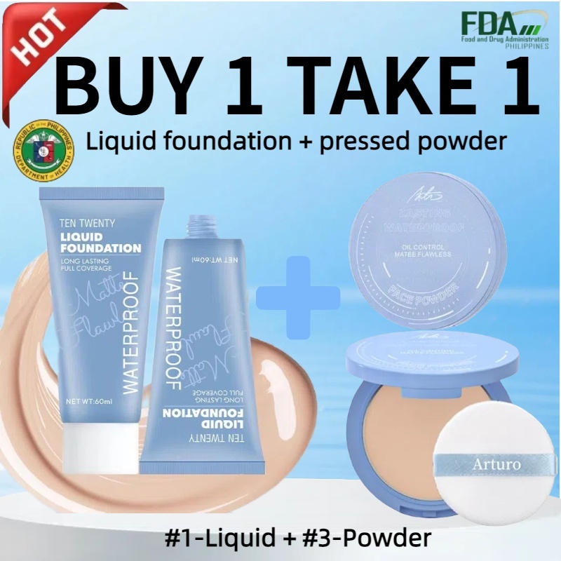 Buy 1 take 1 matte flawless waterproof liquid foundation & oil control matte face pressed powder
