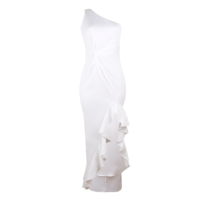 Women One Shoulder Solid Color Ruffled Slim High Slit Long Party Prom Dress