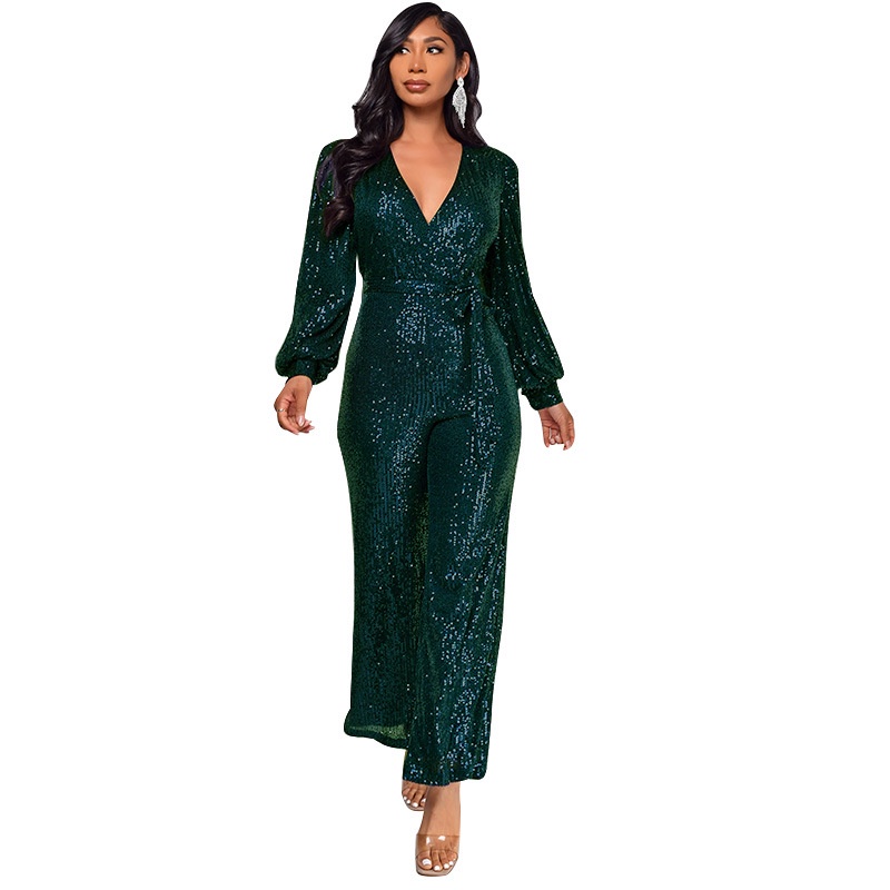 Women Long Sleeves V Neck Glitter Sequins Belt Slim Straight Legs Long Jumpsuit for Club Party Evening Prom Social