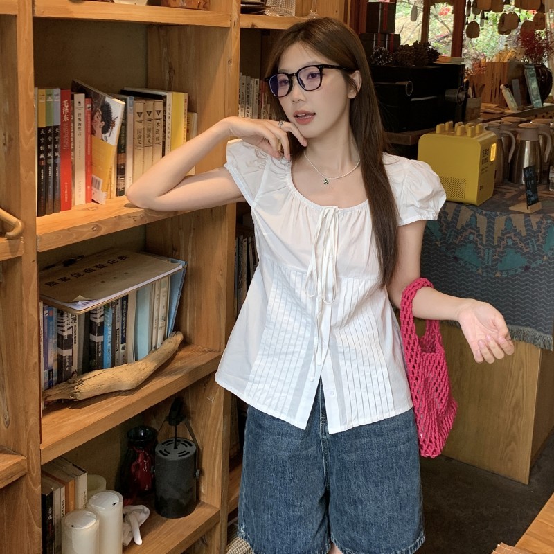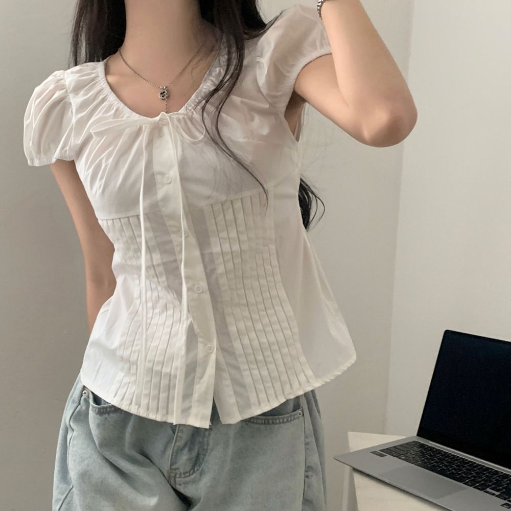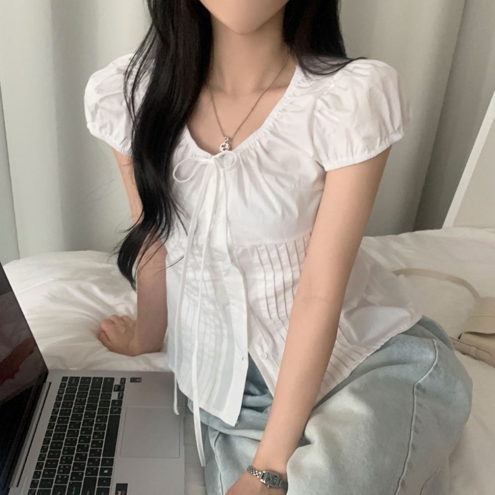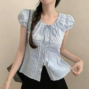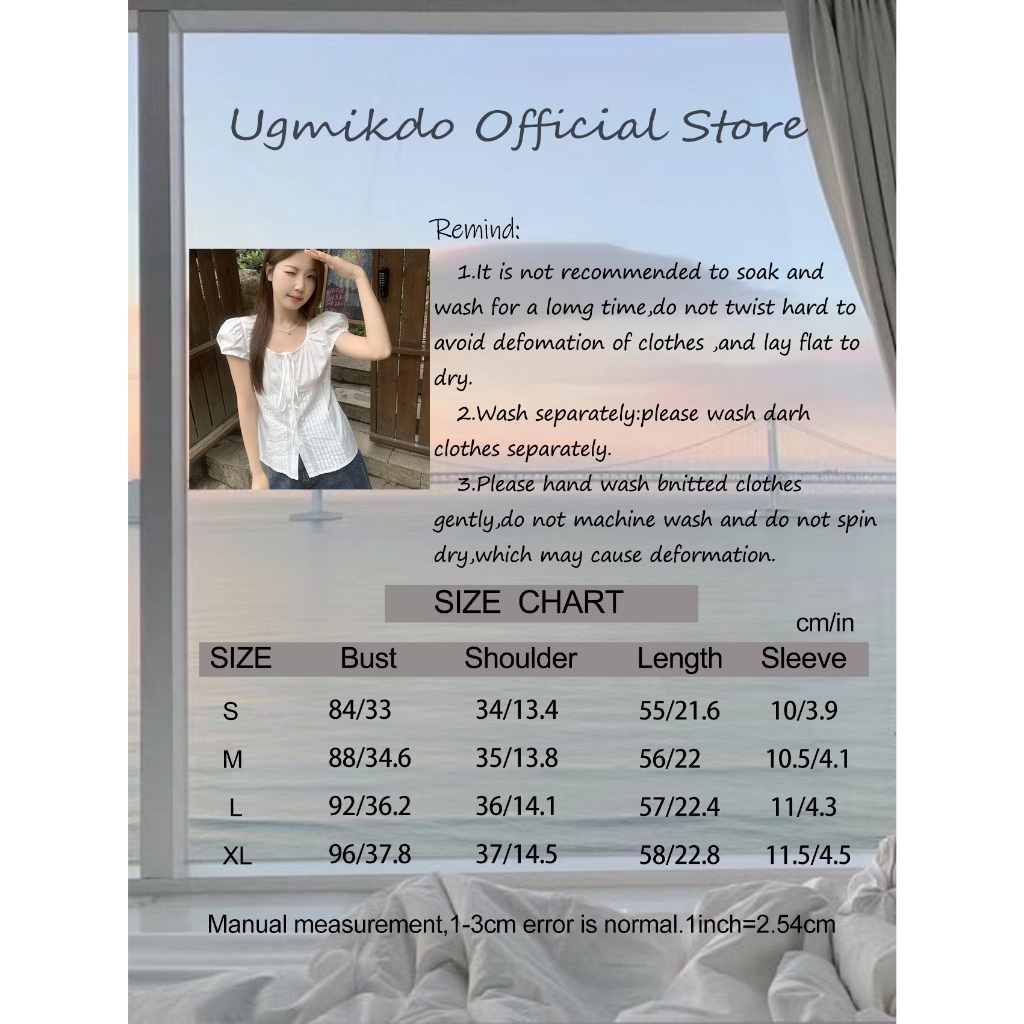 Ugmikdo Korean U-neck short sleeved shirt retro short top for women