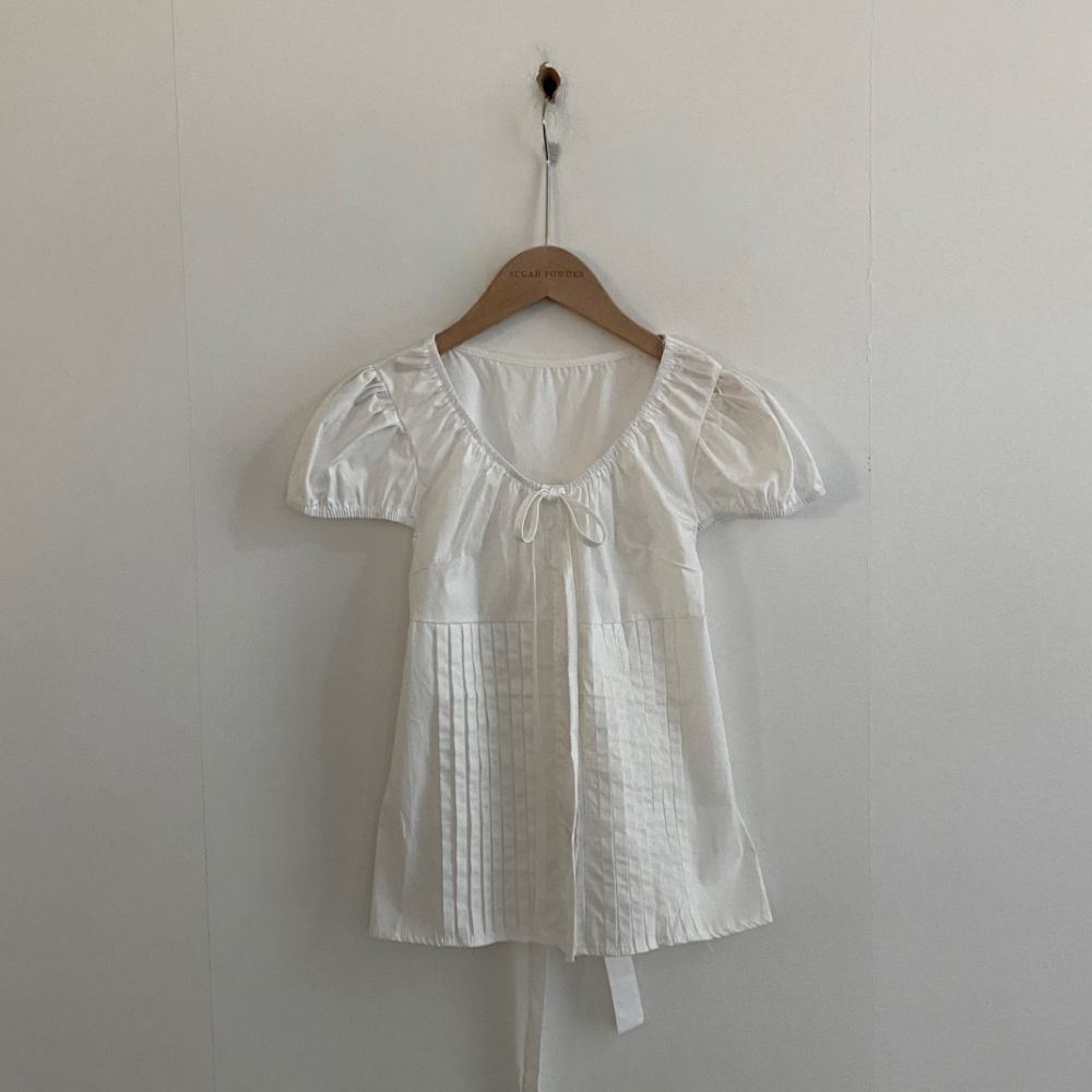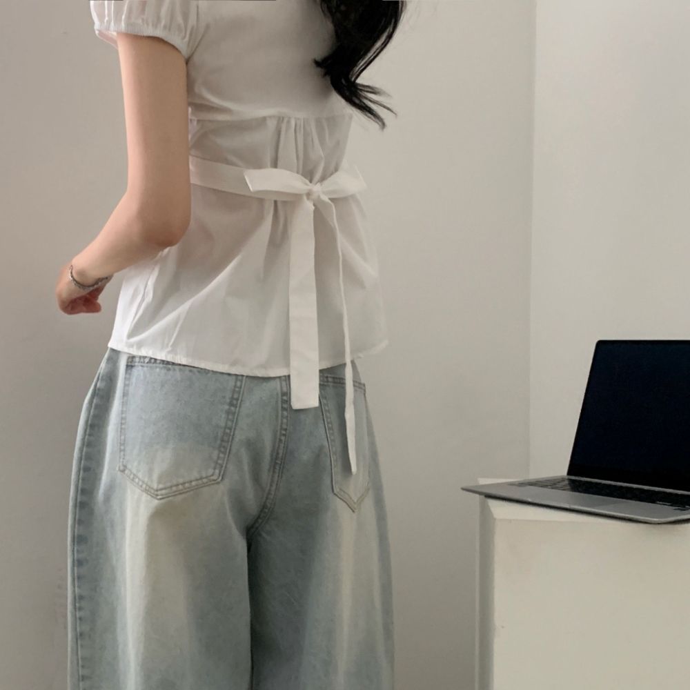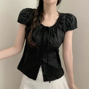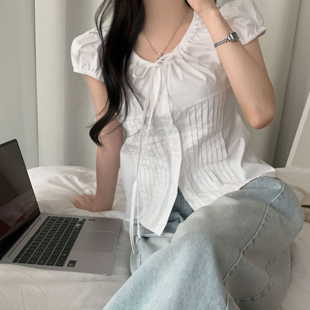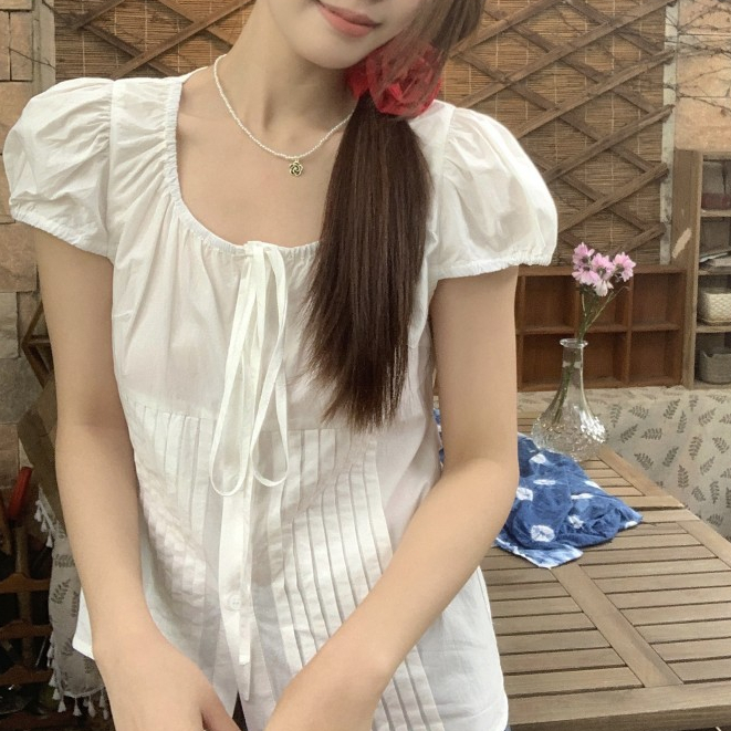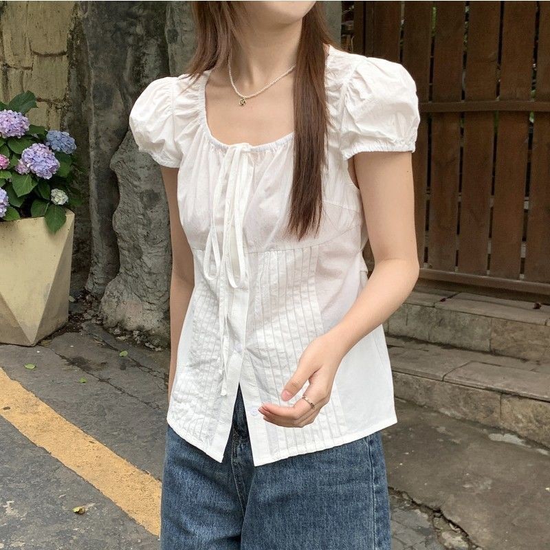 Ugmikdo Korean U-neck short sleeved shirt retro short top for women