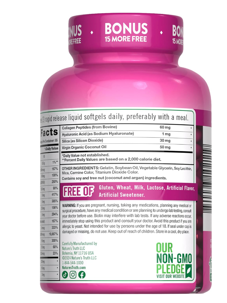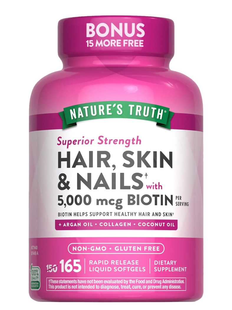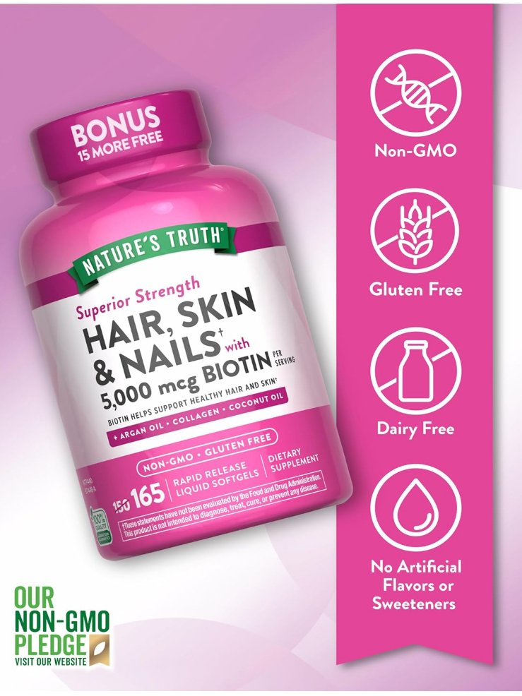 Nature's Truth Hair, Skin & Nails Vitamin | 5000 mcg Biotin | 165 Softgels | with Collagen | Non-GMO