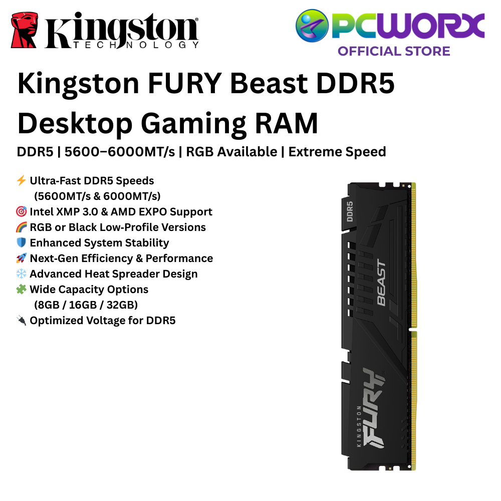 Kingston FURY Beast DDR5 Desktop RAM 8GB / 16GB / 32GB | 5600–6000MT/s | RGB & Non-RGB | CL30–CL36