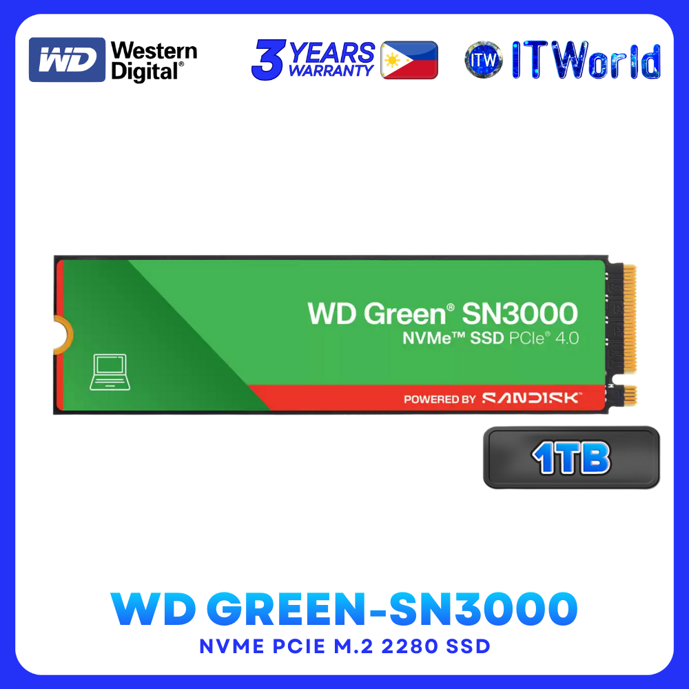 Western Digital WD Green SN3000 SSD – 1TB NVMe PCIe Gen4 M.2 2280 SSD WDS100T5G0E-00VLF0 itw