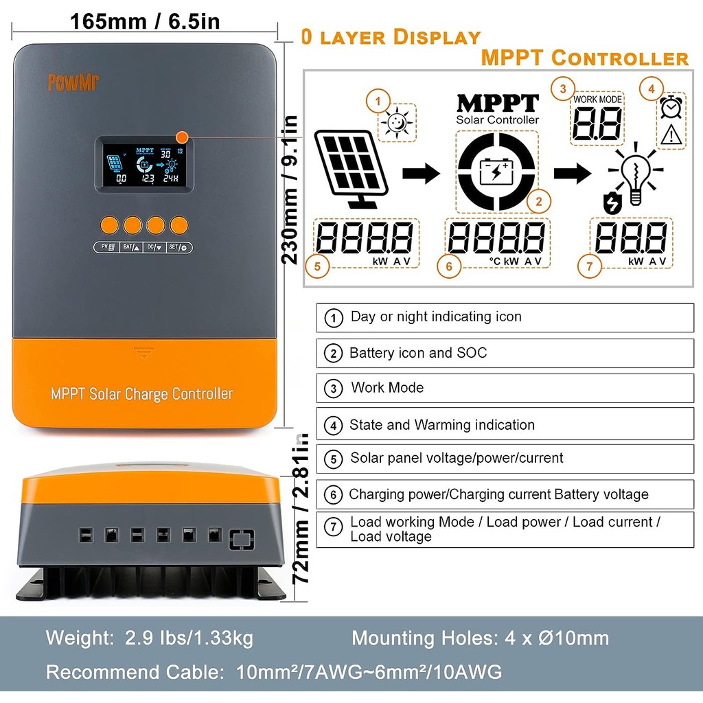 PowMr MPPT 60A Solar Charge Controller 12V/24V/ 36V/48V Automatic LCD Regulator with Backlight Max PV Input 160Vdc Support Lithium Battery Lead Acid Battery 1 Year Free Warranty