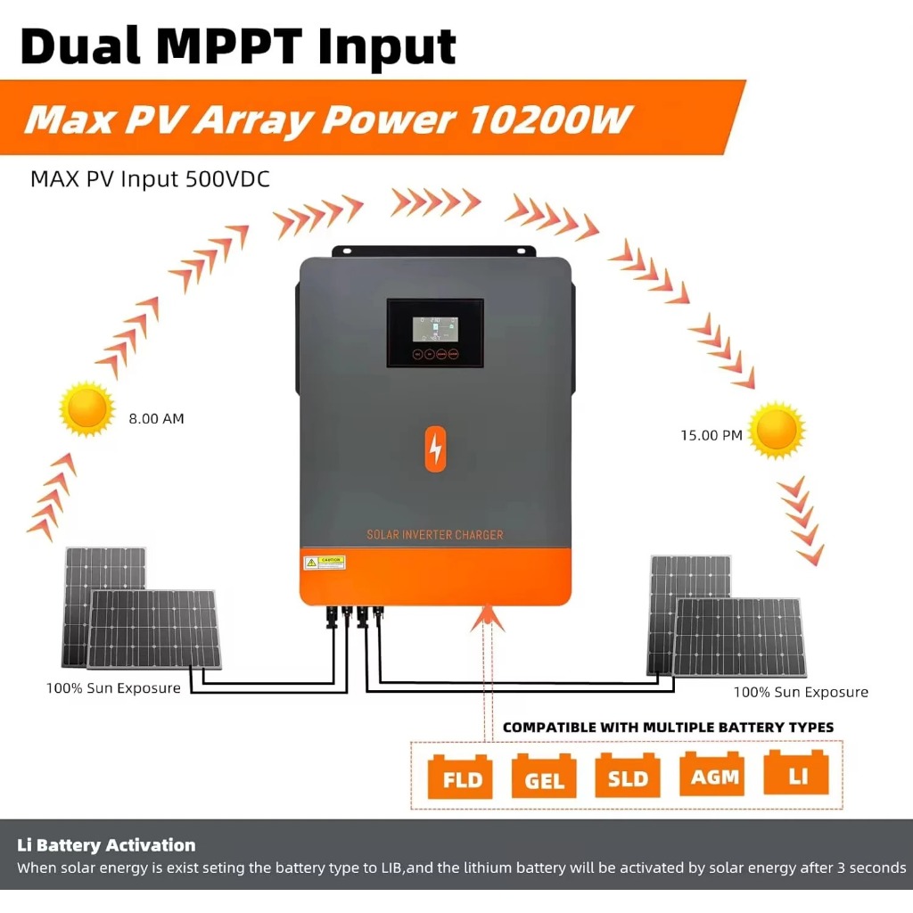 PowMr MPPT 10.2KW Pure Sine Wave Off-Grid/On-Grid Solar Hybrid Inverter 230Vac Built-in MPPT160A Solar Charge Controller PV Max Input 90-500Voc Support 48V Lifepo4 battery 2 years free warranty