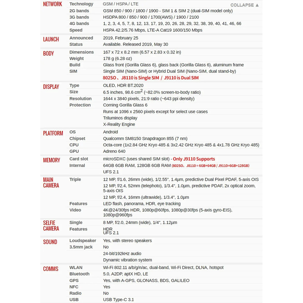 Sony Xperia 1 J8110 J9110 6G+128GB XZ4 Snapdragon 855 6.5" HD Camera NFC Fingerprint Second hand Smartphone