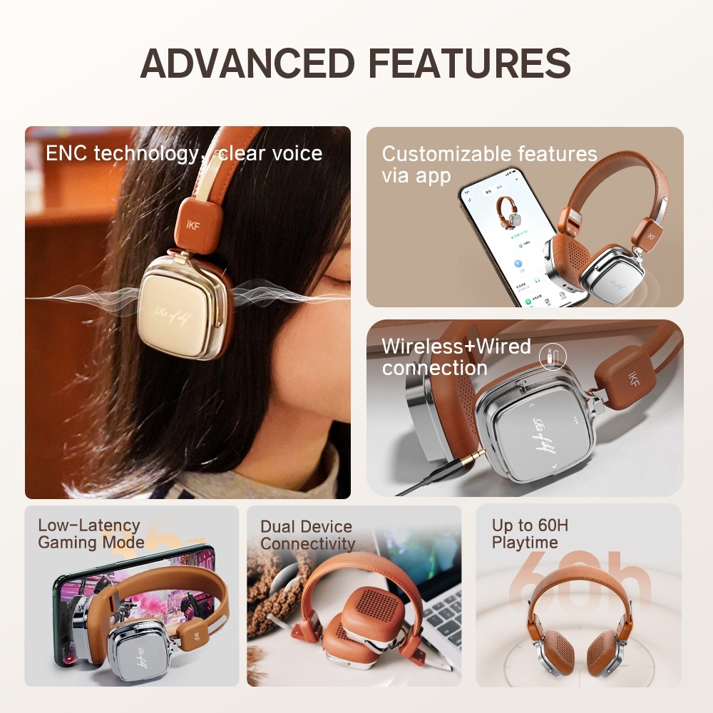 iKF R2 Wireless On-Ear Headphones Retro Wired Headset 60H Playtime Bluetooth V5.4 Multipoint Connect