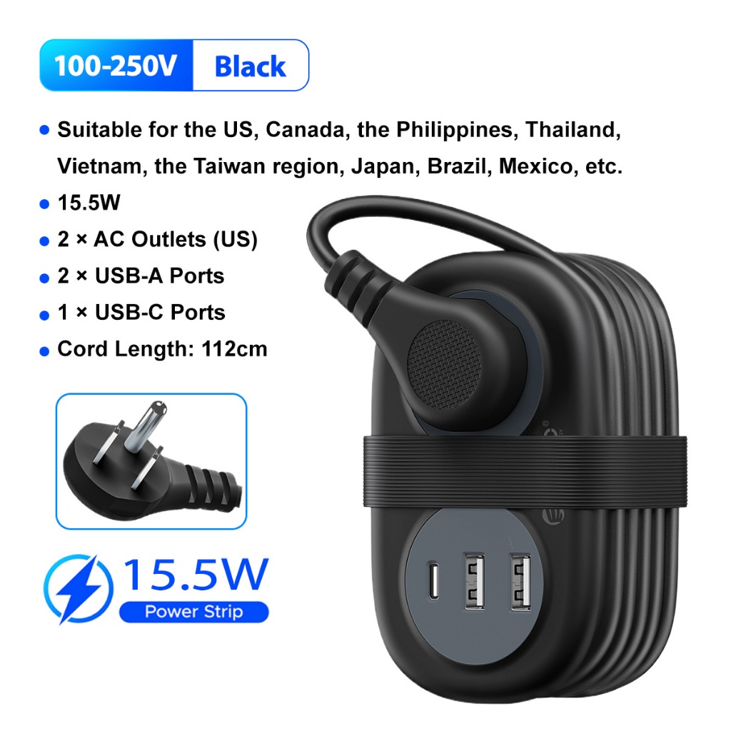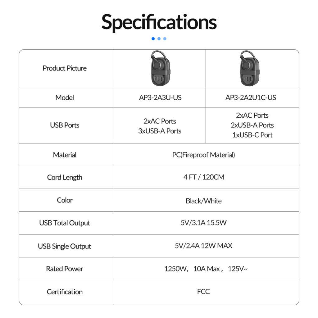 ORICO Travel Power Strip with USB and Type C Ports Retractable Pocket Extension Cord Outlet (AP3-2A)